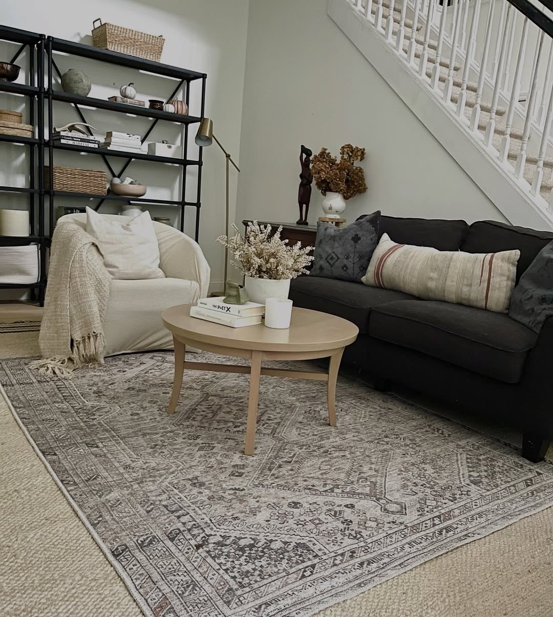 The rug is doing a lot of heavy lifting here—and it’s doing it well. That vintage-inspired pattern anchors the whole space, making everything feel cohesive and grounded.