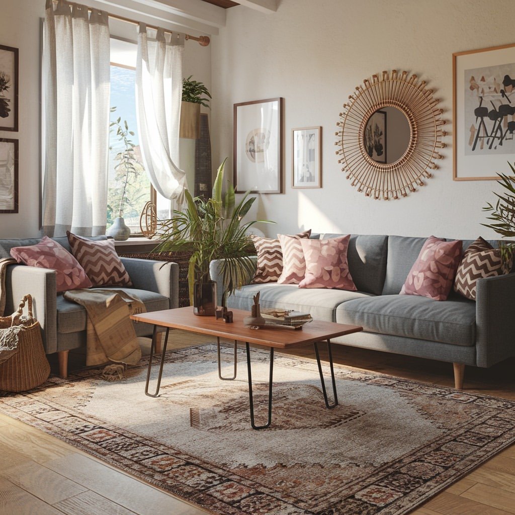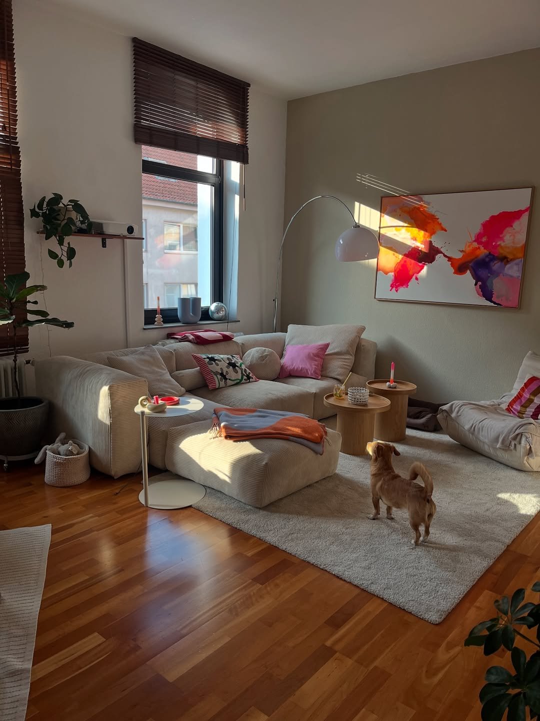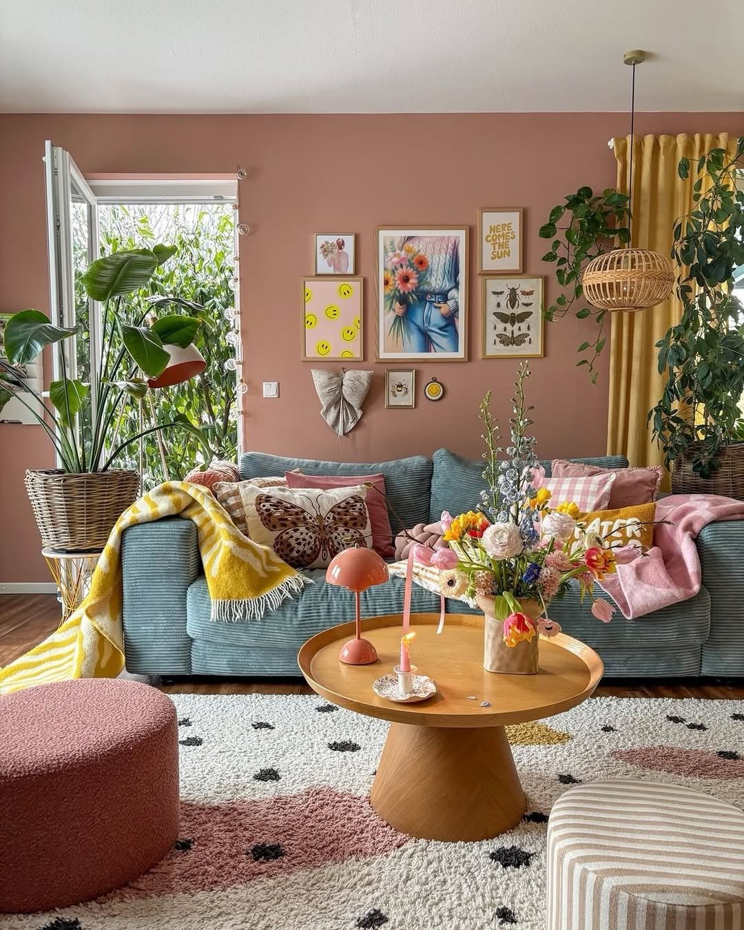 This one is cozy—but make it fun. The mix of colors, textures, and wall art creates a space that feels alive and expressive without losing that warm, inviting feel.
