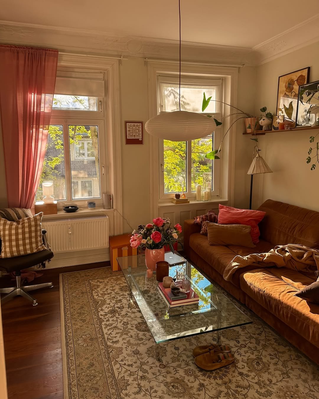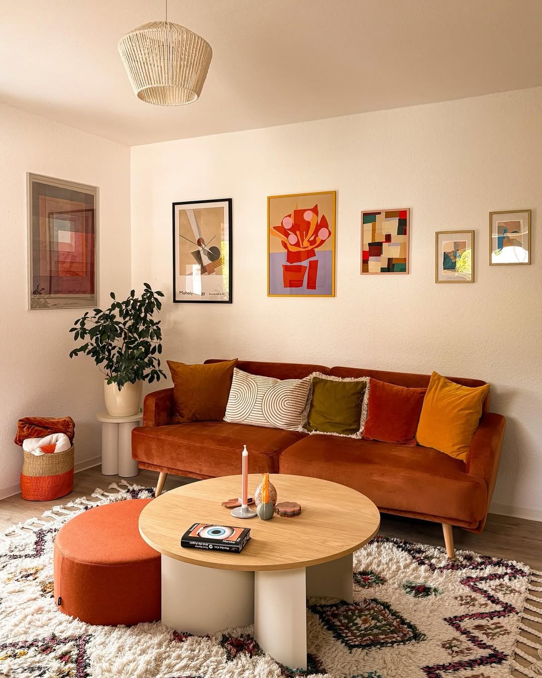 There’s something so fun about this setup. The burnt orange sofa, layered textures, and bold artwork make the whole room feel lively without losing that cozy core.