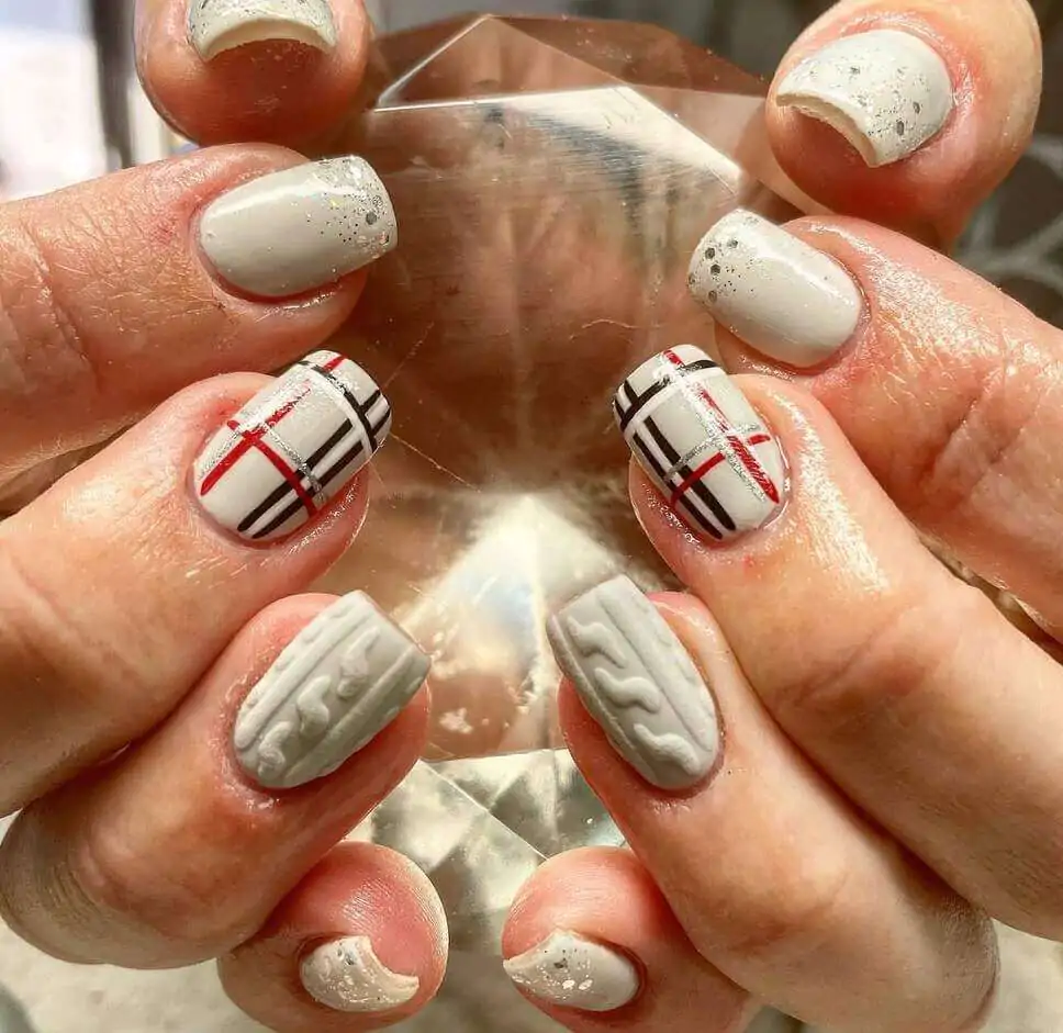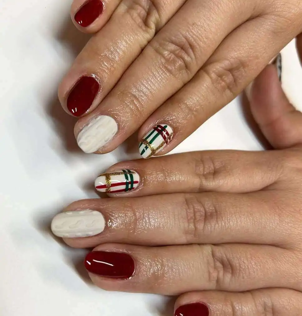 @nyonbywhitney taps into classic holiday colors with glossy reds, creamy cable-knit whites, and plaid accented with gold threads. It feels festive but sophisticated — the kind of nails you’d wear to a holiday dinner party or a cozy night unwrapping gifts.