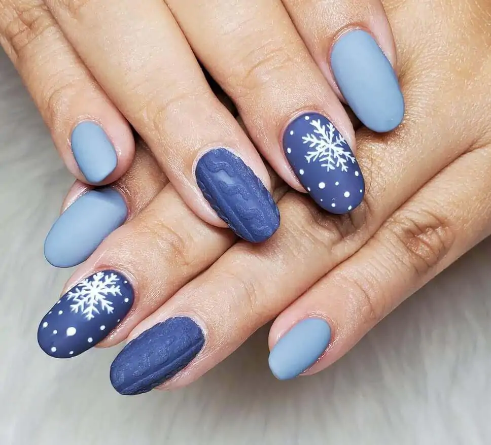 @fantasticnailsandspa proves blue doesn’t mean cold. These navy and sky blue matte nails are softened by snowflake accents and textured knits that practically beg for mittens.