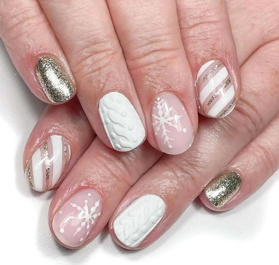 @skintegrityesthetics brings out all the holiday sparkle with this mix of soft pinks, crisp whites, and gold accents. The candy-striped nails and snowflakes feel festive without going overboard, while the white embossed knits keep everything grounded in cozy winter charm.