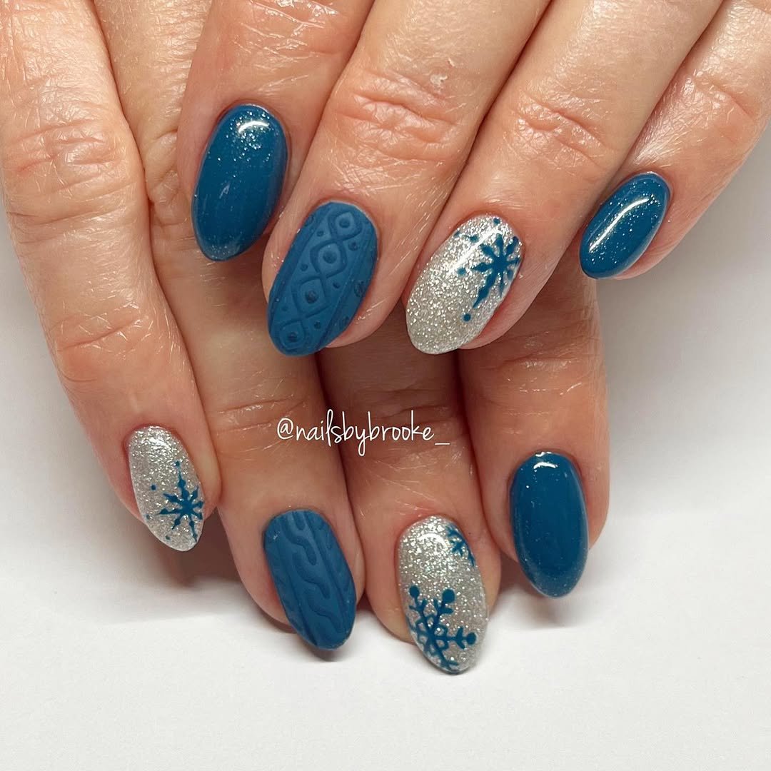 @nailsbybrooke___ goes all in on the winter blues — the pretty kind. Deep teal, shimmering silver, snowflakes, and beautifully detailed knit work create a look that feels like a frosty walk at dusk. There’s just enough sparkle to keep things festive without overpowering the cozy texture.
