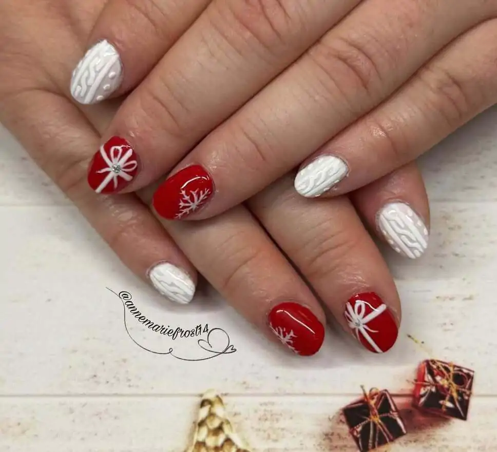 This one’s like wrapping paper and wool socks had a baby — and @annemariefrost14 was the glam midwife. Red and white take center stage in this cozy-gifted combo, with embossed sweater textures and dainty snowflakes that feel straight out of a snowy cottage scene.