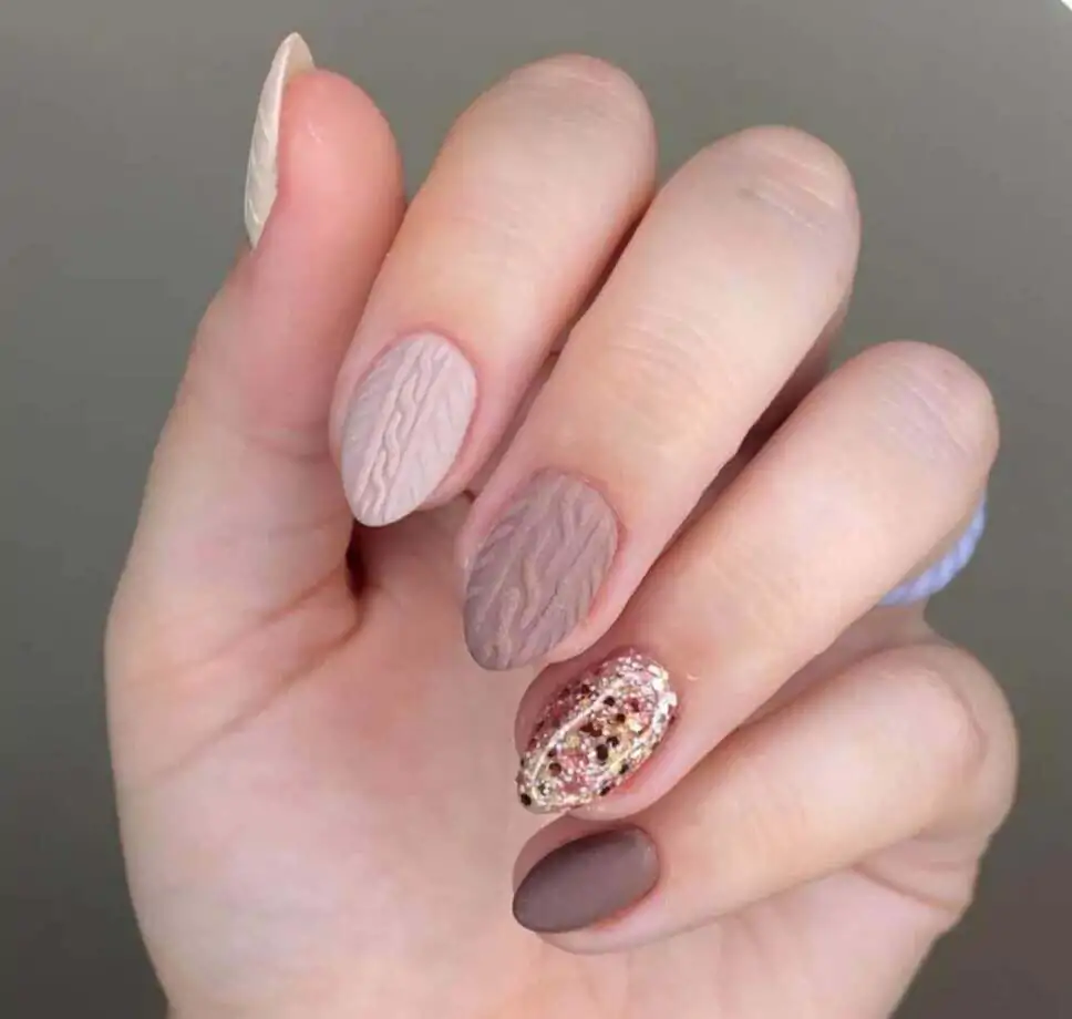 @peppigel keeps things soft and elegant with this neutral knit-and-glitter blend. The taupe and beige tones feel earthy and warm, while the gold glitter nail adds the perfect festive flare. The knit texture is subtle here, almost whisper-soft.