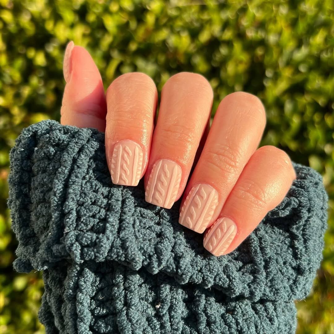 @revelnail leans into that soft, sun-kissed cozy vibe with these creamy nude sweater nails. The cable-knit detailing looks almost sculpted, catching the light in the sweetest way — like the texture of your favorite cardigan warmed by a sunny winter afternoon.