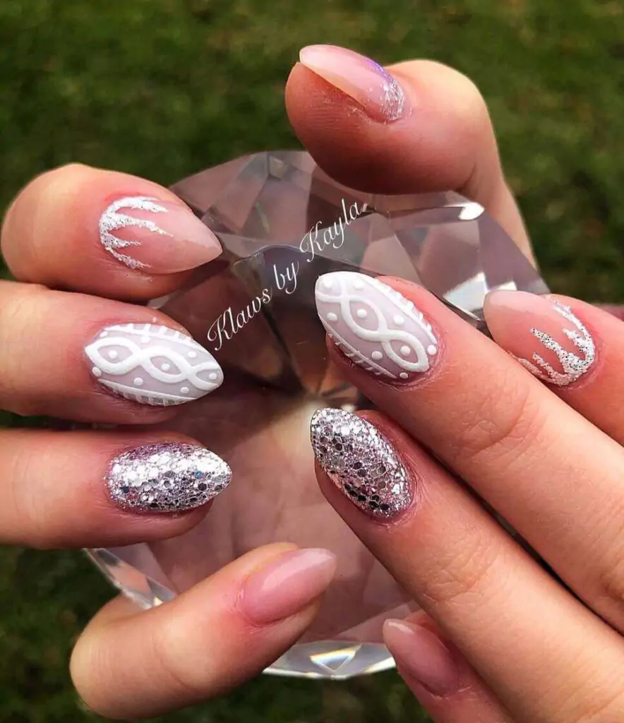 @klawsbykayla brings a little winter magic with this mix of frosted knits and high-shine sparkle. The white embossed cable pattern feels soft and cozy, while those glitter-packed accents bring unmistakable holiday glam. It’s the kind of combo that makes you want to hold a mug of hot cocoa just to admire your nails.