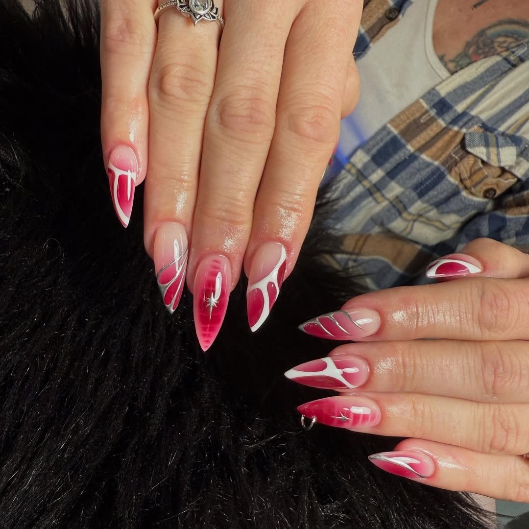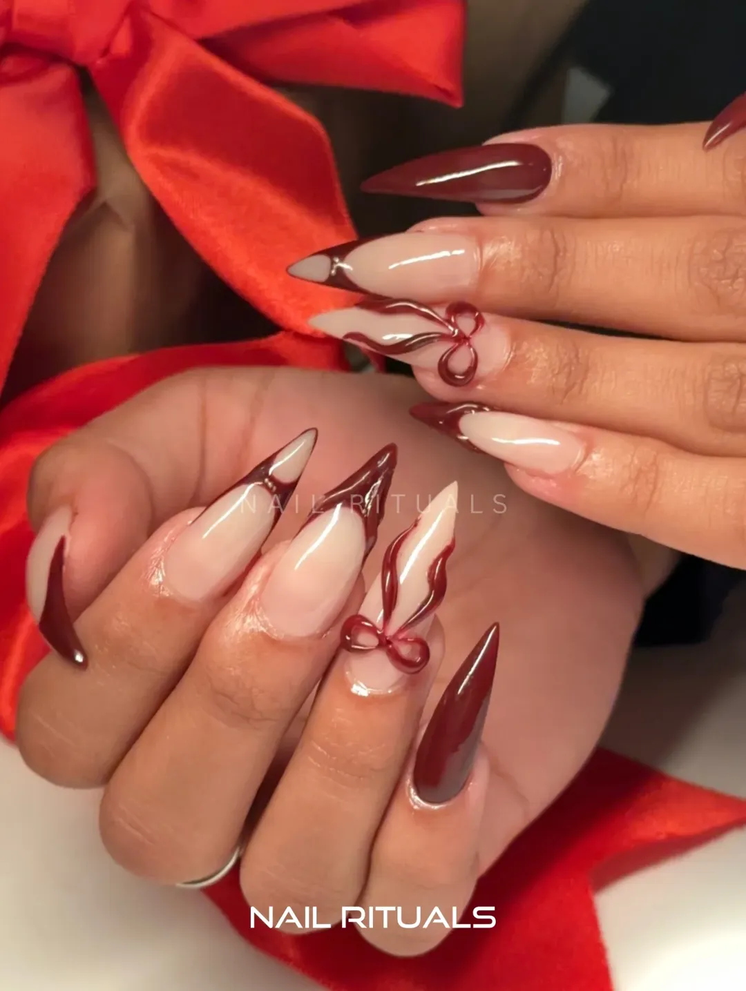 Now this is cranberry with personality. The sharp tips, negative space, and those sculpted bow details give high-fashion energy without crossing into costume territory.