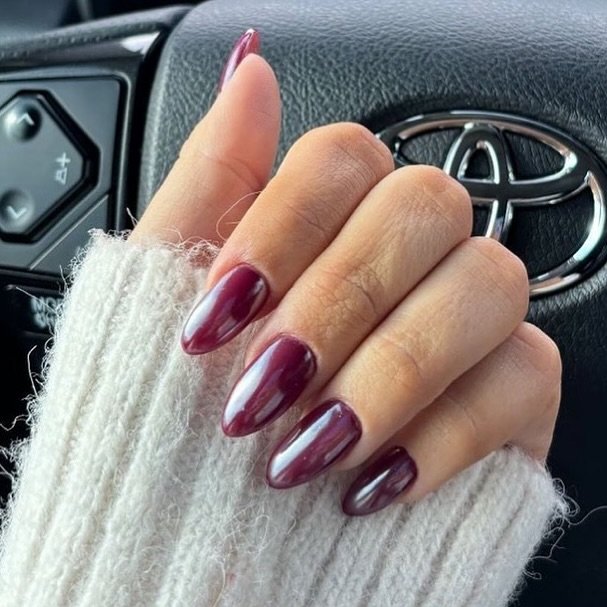 This set keeps it sleek and timeless with a smooth, glossy cranberry finish and a clean almond shape. Nothing flashy—just really good nails done right.