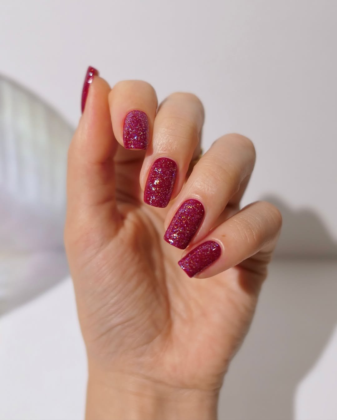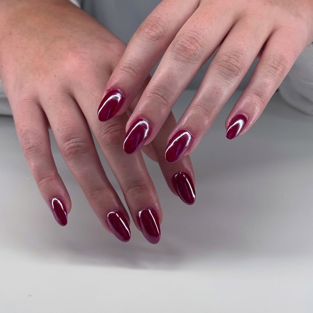 These nails catch the light in the best way. That fine shimmer layered over a cranberry base creates a glowing, almost molten effect that changes as you move.