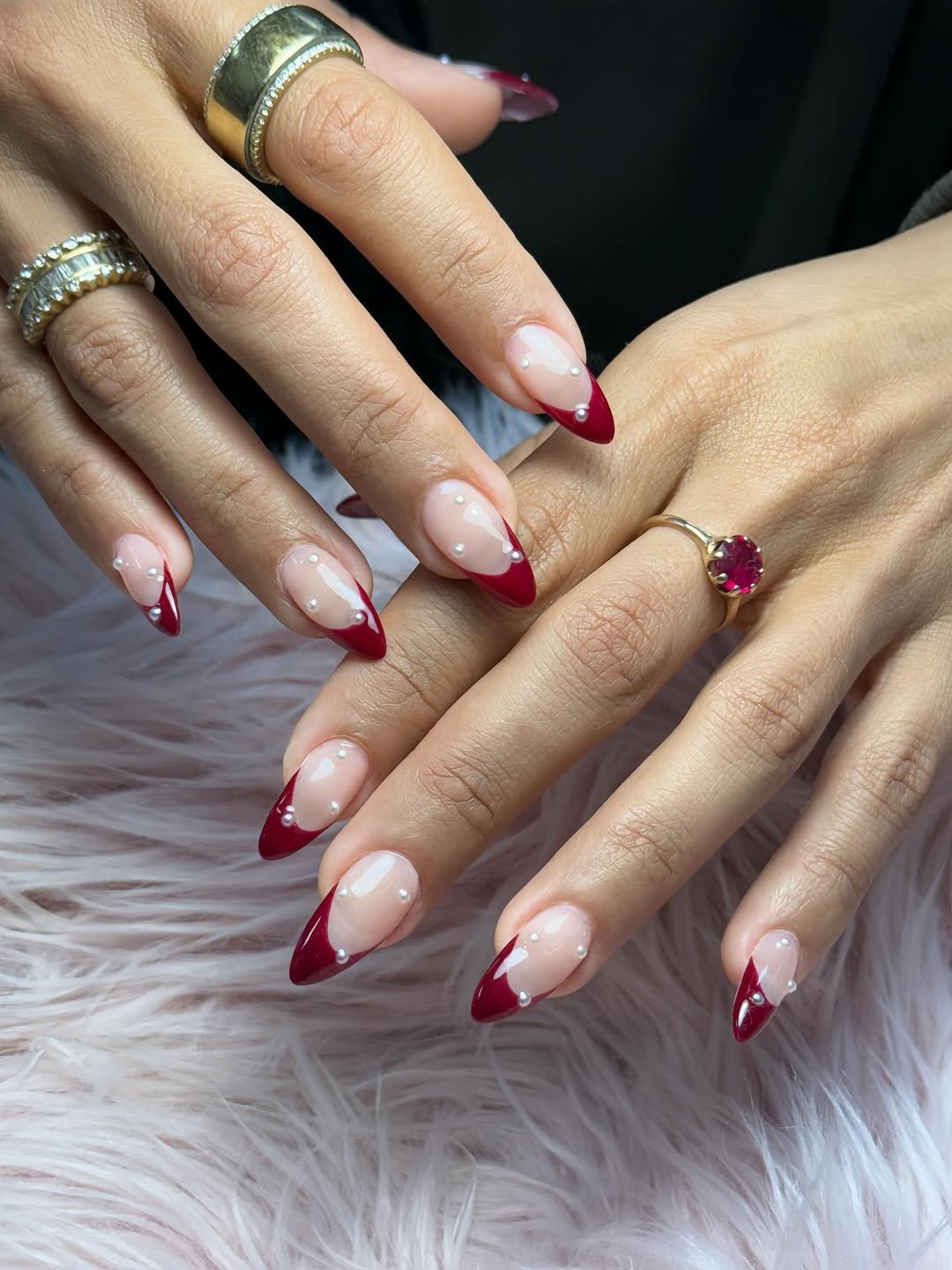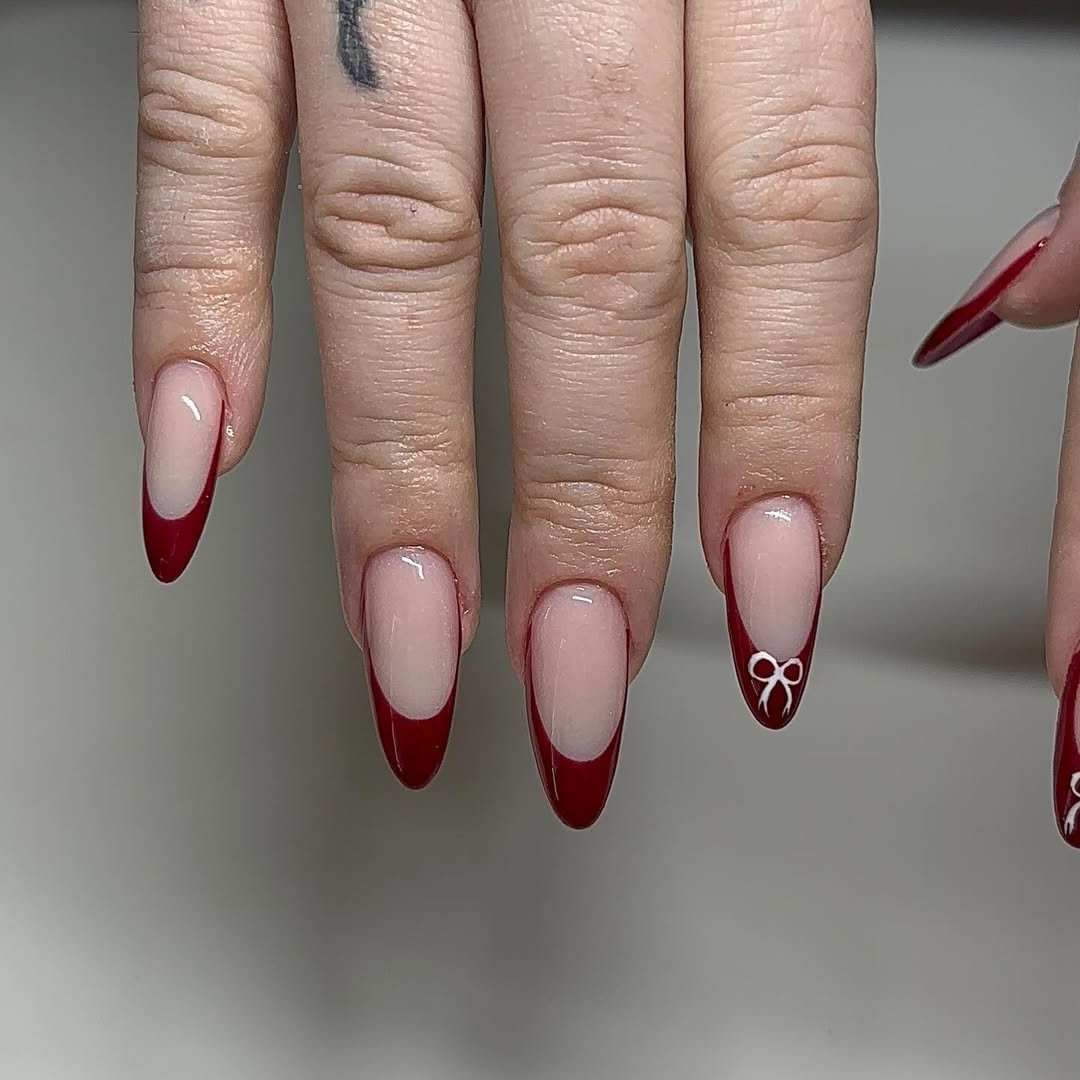 Cranberry French tips instantly feel elevated, and those tiny pearl accents seal the deal. Soft nude bases keep everything balanced while the red tips do the talking.