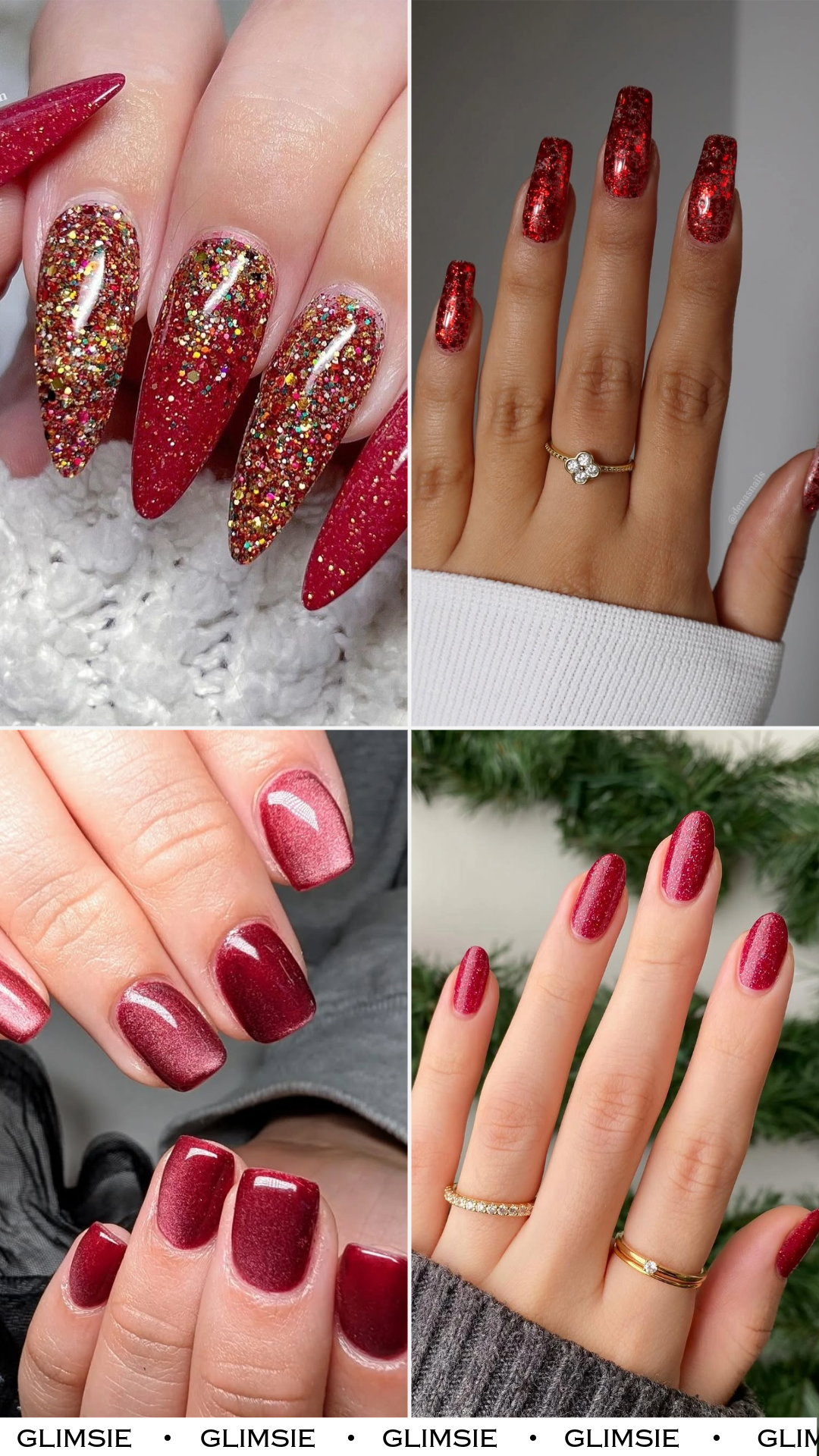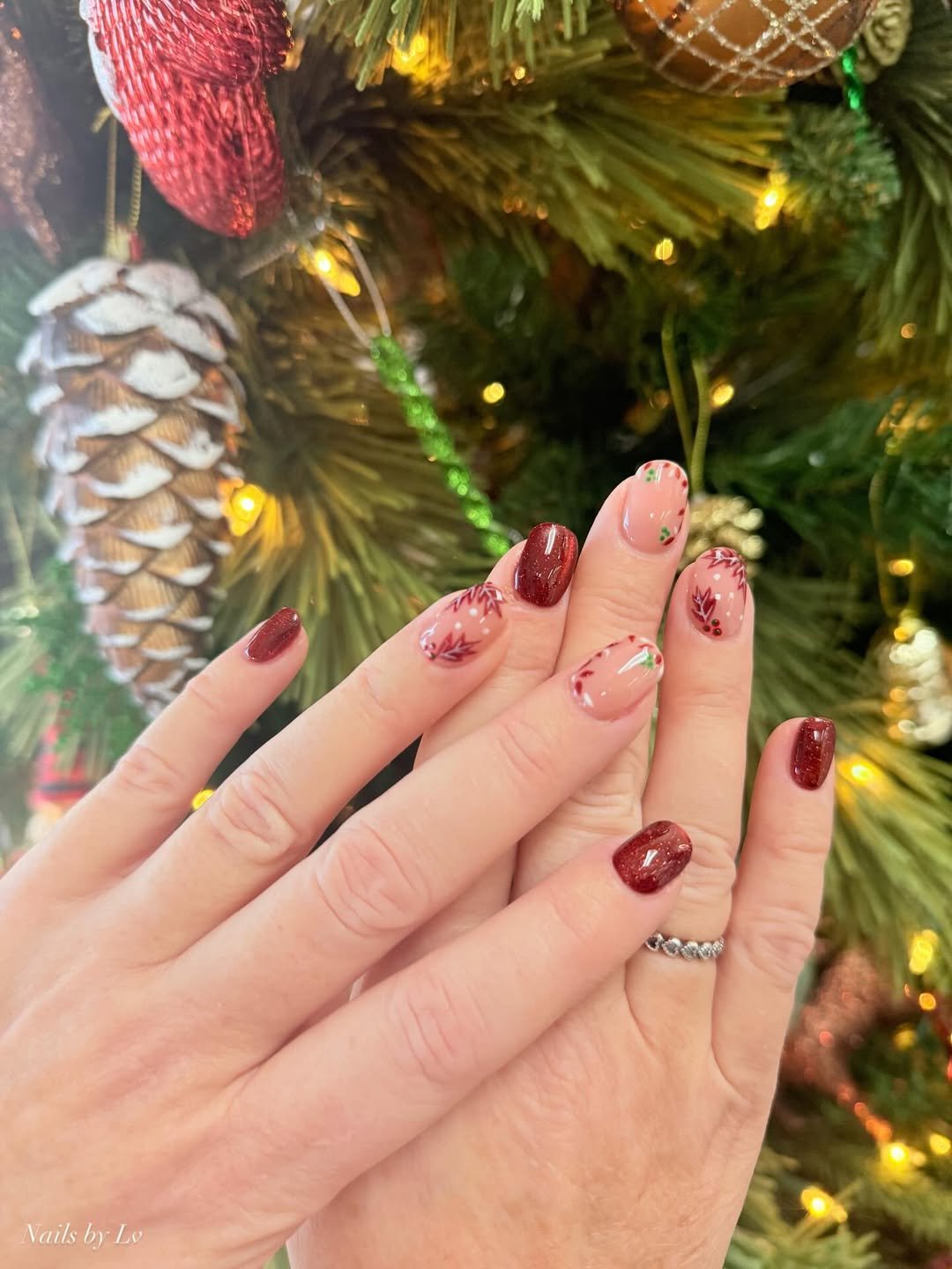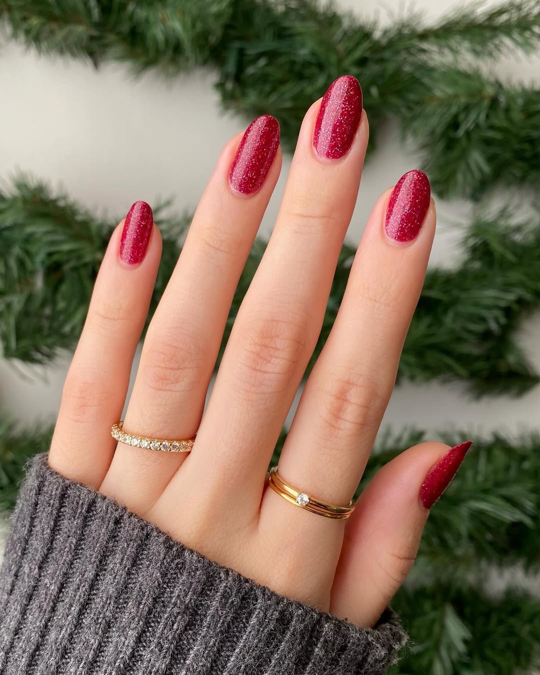 These nails feel calm, cozy, and quietly festive. The fine shimmer layered over cranberry red gives a soft glow instead of a loud shine, which makes the whole look feel wearable and grounded.