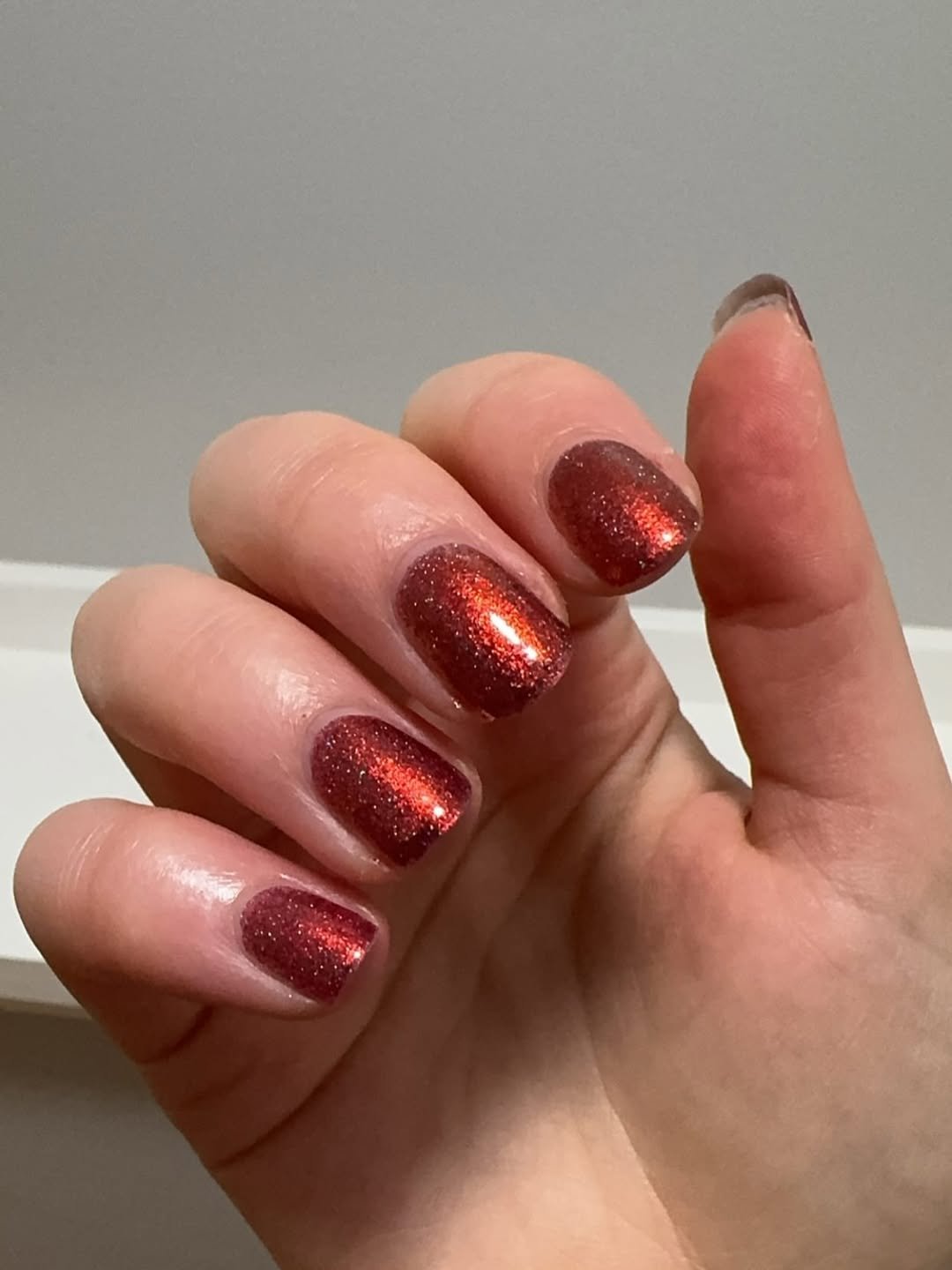 Short, shimmery, and full of warmth, this cranberry has a coppery glow that feels perfect for cooler months. The sparkle is fine and flattering, giving a soft, lit-from-within effect.