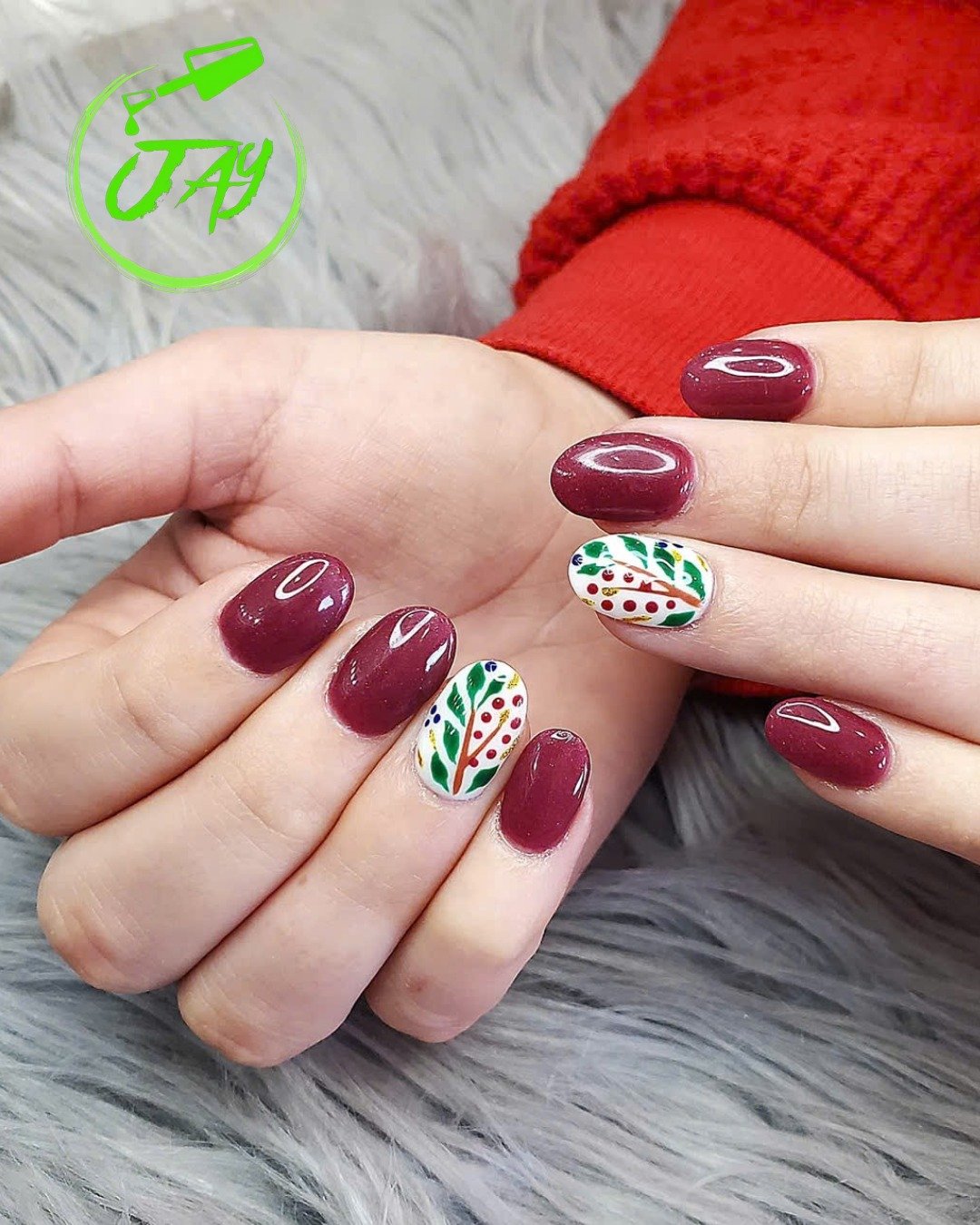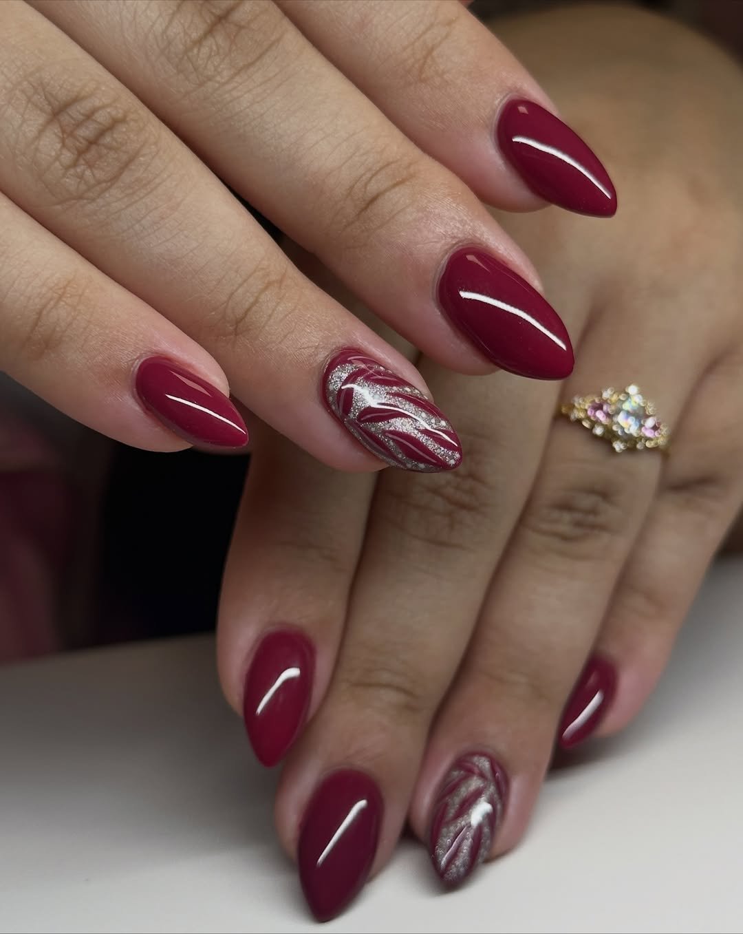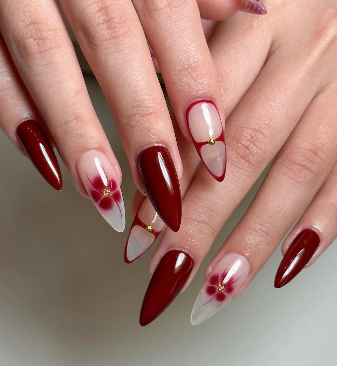 I love how this look mixes solid cranberry with playful accent moments. It keeps the palette cohesive while letting a few nails steal the spotlight.