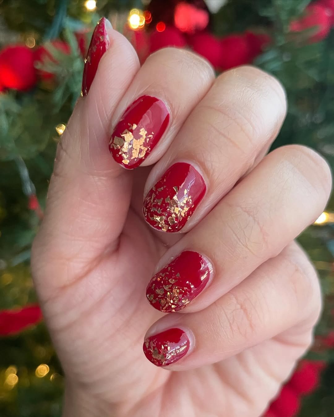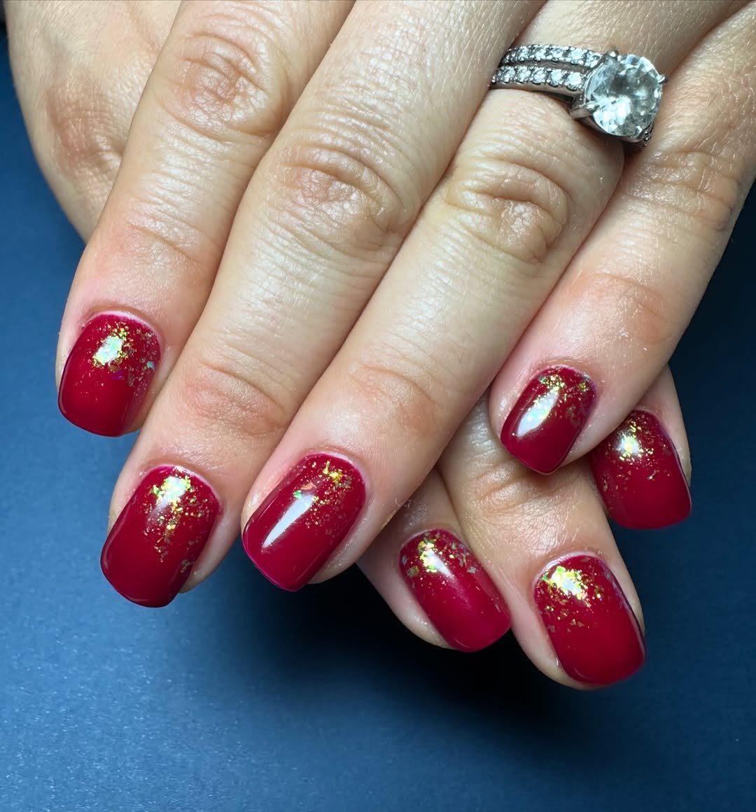 This look feels like a holiday heirloom. That deep cranberry base paired with scattered gold foil has a quiet richness to it—festive without being flashy. It’s the kind of manicure that catches candlelight beautifully and feels right at home wrapped around a warm mug.