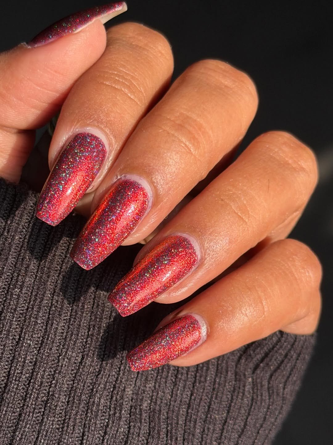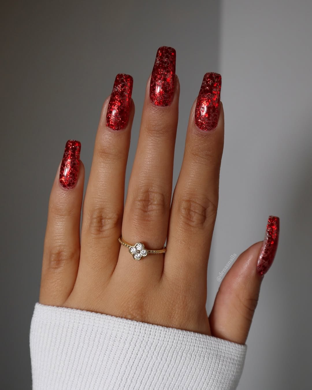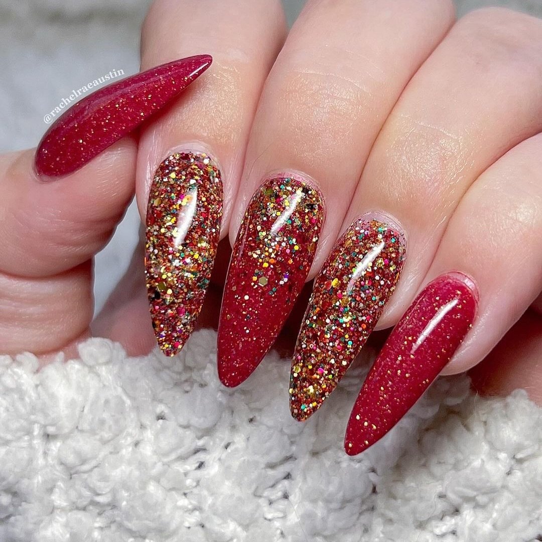 This is cranberry red turned all the way up. Dense glitter, bold shine, and a shape that doesn’t apologize for its presence—these nails are pure celebration. They sparkle like crushed garnets under bright lights.