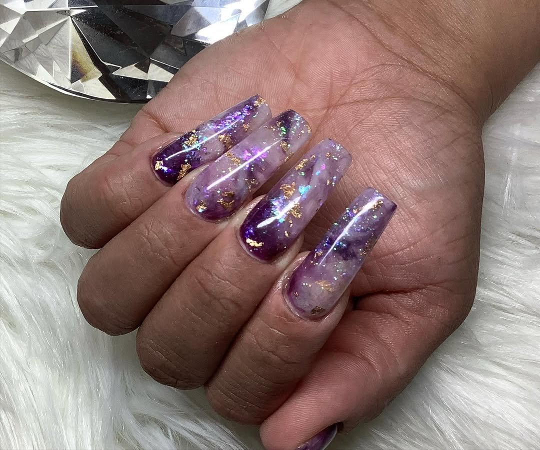 With @lissettesgelnails, it’s all about creating depth. These purple-toned nails layer translucence with flecks of gold foil and galaxy-like swirls, making them look like tiny geodes captured in resin. There’s a cosmic, otherworldly vibe here — ethereal but also grounded with that rich amethyst palette.