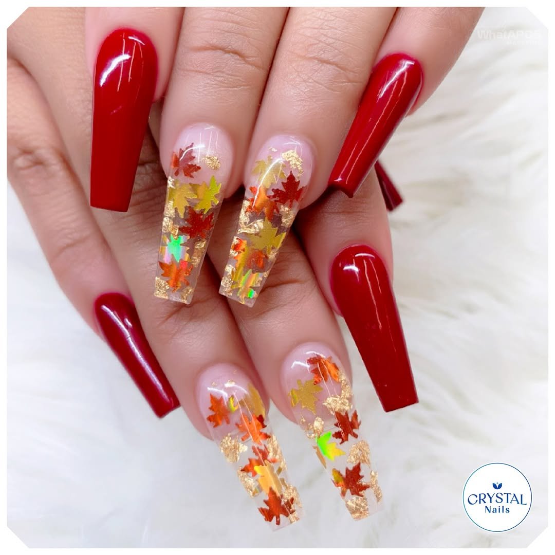 This fall-inspired set from @crystalnails.tx feels like diving into a pile of golden leaves—if those leaves were holographic and perfectly placed in clear acrylic. Paired with rich crimson nails, the clear tips turn into glowing collages of foil, maple motifs, and soft amber tones.