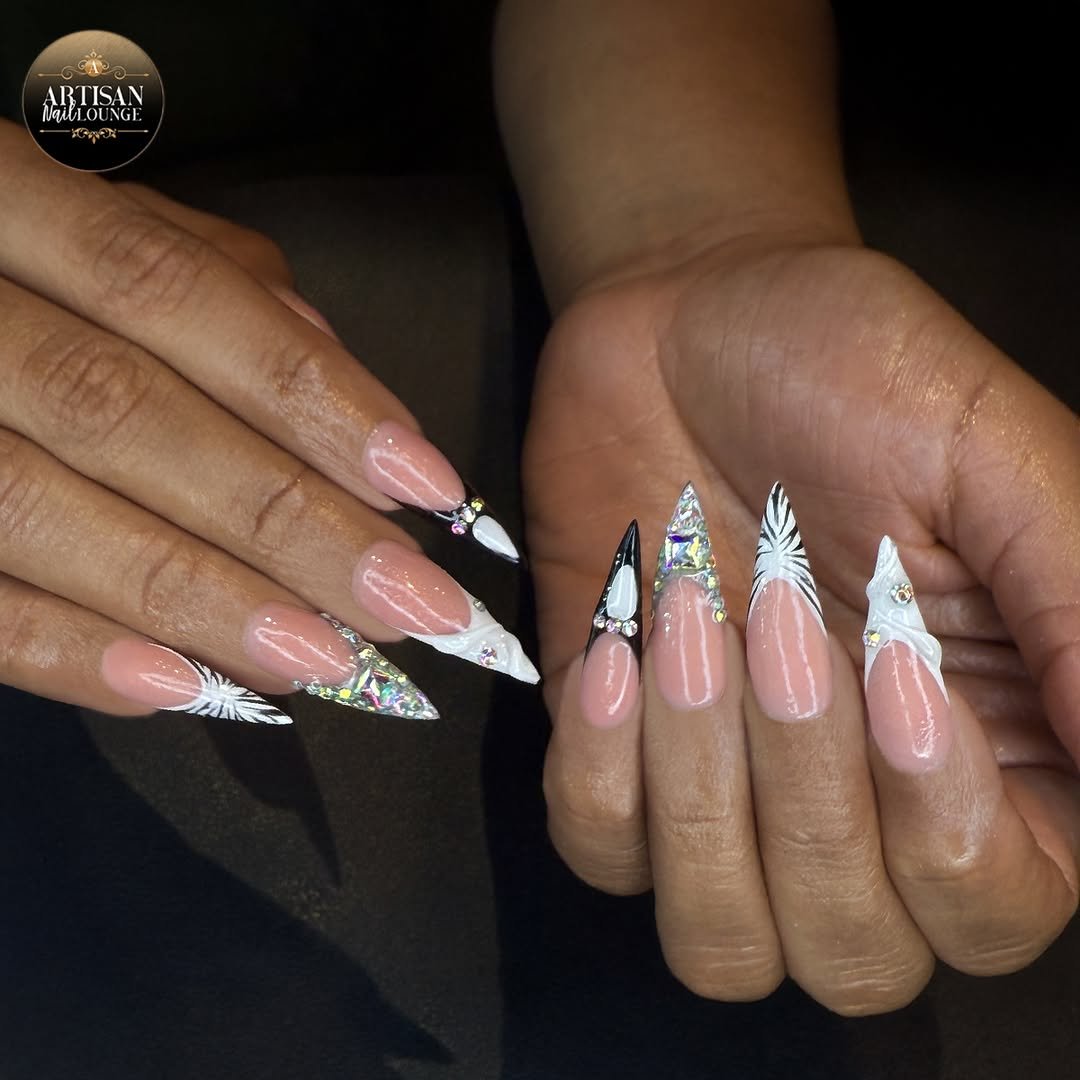 This one’s got drama, detail, and serious dimension. @artisannaillounge brings sculptural energy to a classic pink base with sharply tapered stiletto tips dressed in jet black, soft white, and iridescent shards. There’s something so satisfying about how the negative space lets each design breathe—from 3D swirls to sharp linework and gleaming rhinestones, every nail tells a slightly different story.