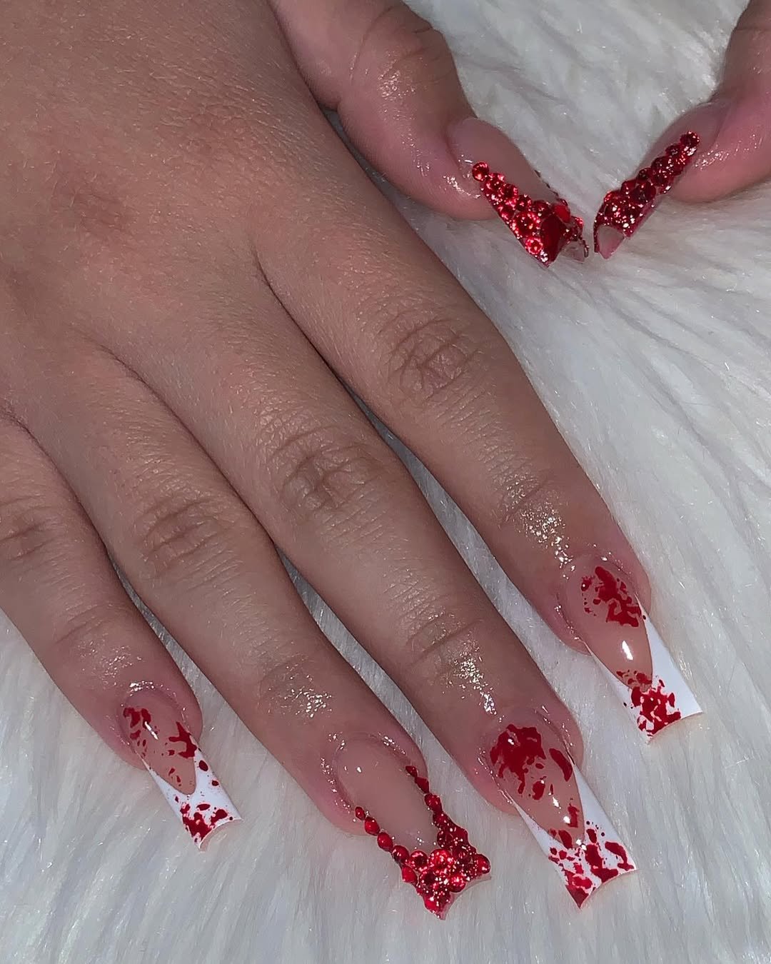 Okay, this one’s not for the faint of heart—and that’s exactly the point. @bluestreakcrystals leans into full Halloween horror glam with splattered red polish that looks like it belongs in a killer scene (in the chicest way possible). Some nails go full-on gore with crimson rhinestones, while others keep things minimal with milky white backgrounds and dripping accents.