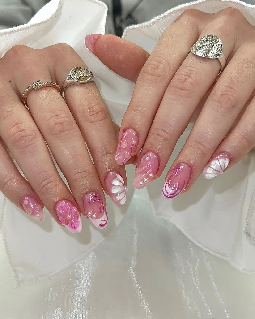 This set from @passionnails_simi is full-on fun. Pink swirls, floral motifs, and bubbly 3D textures make each nail a tiny piece of candy-coated art. There’s a lighthearted playfulness here that’s impossible not to smile at.