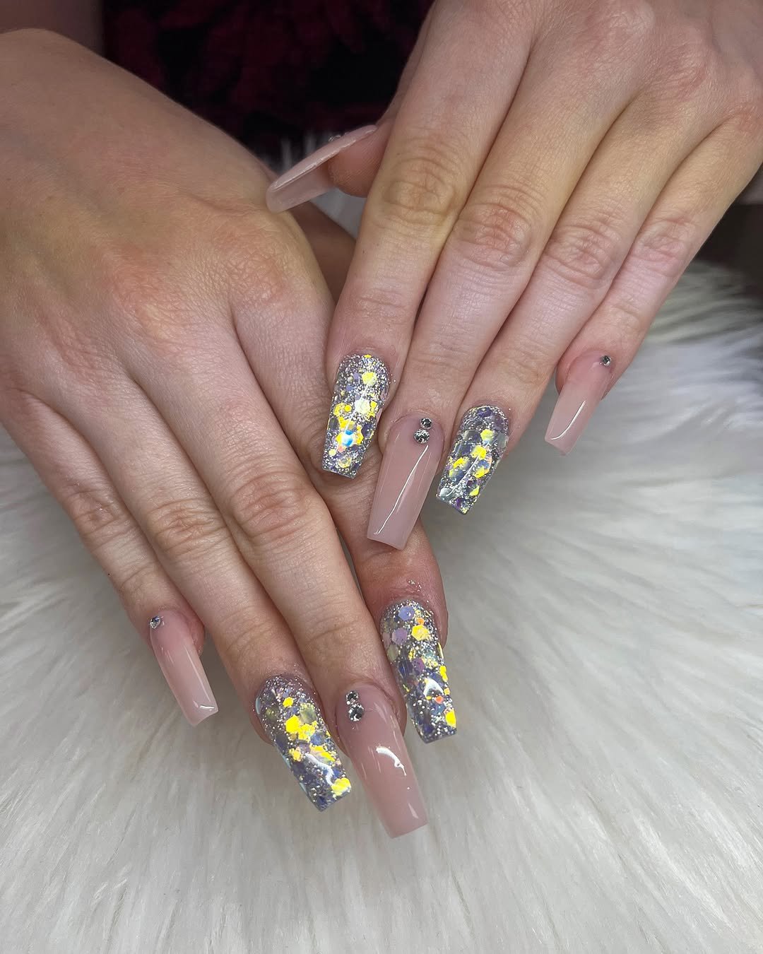 This set by @boujeenailsandspa is basically a party on your fingertips. The glitter is chunky, reflective, and sprinkled like holographic confetti over a milky nude base, giving off a playful energy that’s hard to ignore. It’s bold but balanced—especially when paired with clean, glossy accent nails topped with a single gem.