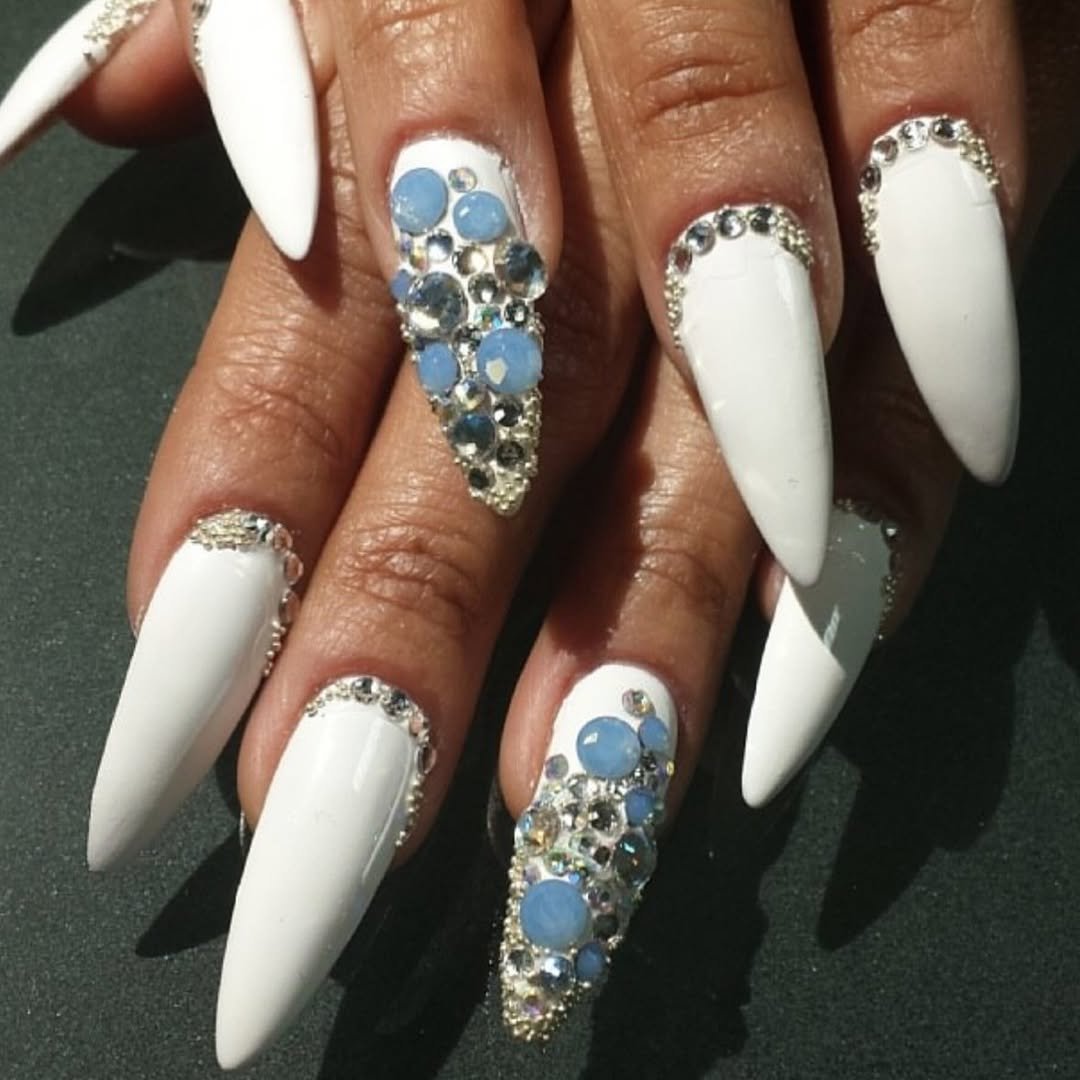 White never looked this powerful. These almond-shaped nails drip in icy blue and silver rhinestones, creating a frosty, regal vibe. It’s clean, modern, and dramatic all at once.