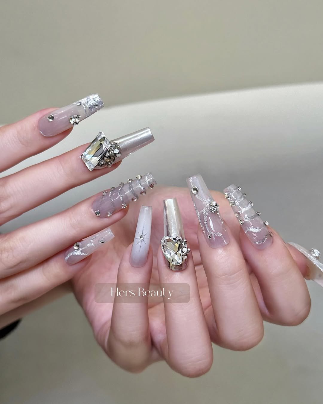 And while it’s unapologetically glamorous, it still has a sleek, polished energy. The sheer and chrome finishes underneath stop it from feeling too heavy, letting the crystals do the talking. This is nail art for when you want your hands to be the center of attention — and trust me, they will be.
