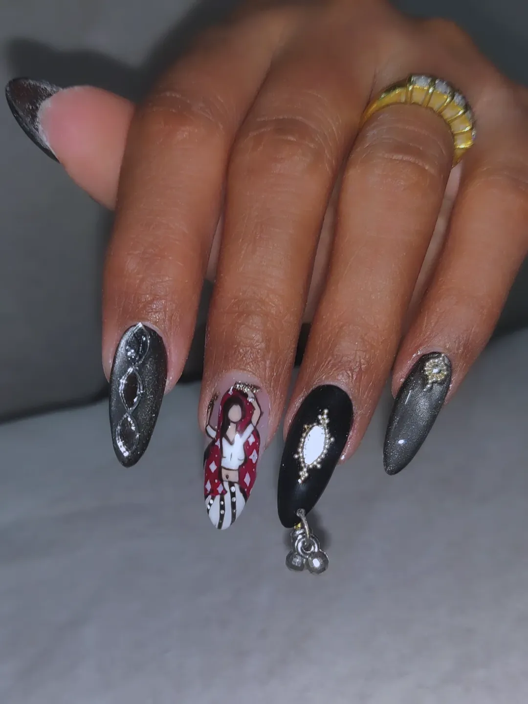 If cherry cola had a nail set, this would be it. @crystal_nailspa brings sultry glamour with this deep, moody palette that blends shimmery metallics, hand-drawn details, and a show-stealing center nail painted with a stylized figure (yes, she’s iconic). The matte-meets-gloss finishes make each nail pop in a different way.