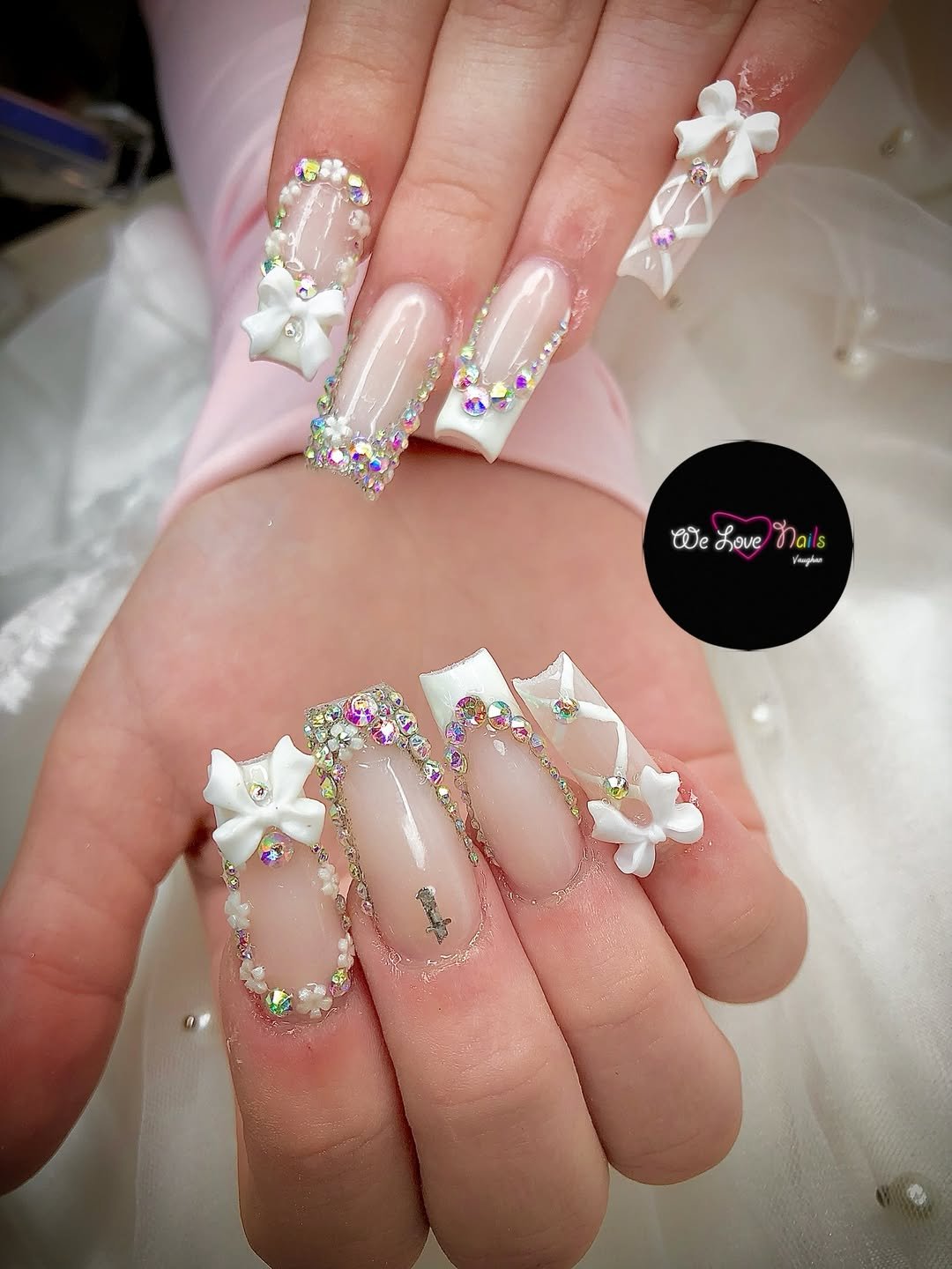 Whimsical, delicate, and just a little extra—these nails are like a fairytale manicure. French tips outlined in tiny crystals, adorned with pearly white bows, create the dreamiest bridal or special-occasion look.