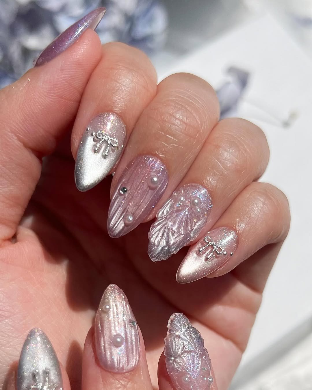 This set from @dreamylittlenails feels like stepping into a winter wonderland. Soft shimmering pinks and silvers are sculpted with intricate 3D details, delicate pearls, and tiny metallic bows that look almost like jewelry. There’s a dreamy softness here, like snowflakes falling under twinkling lights. Each nail feels like its own little ornament.
