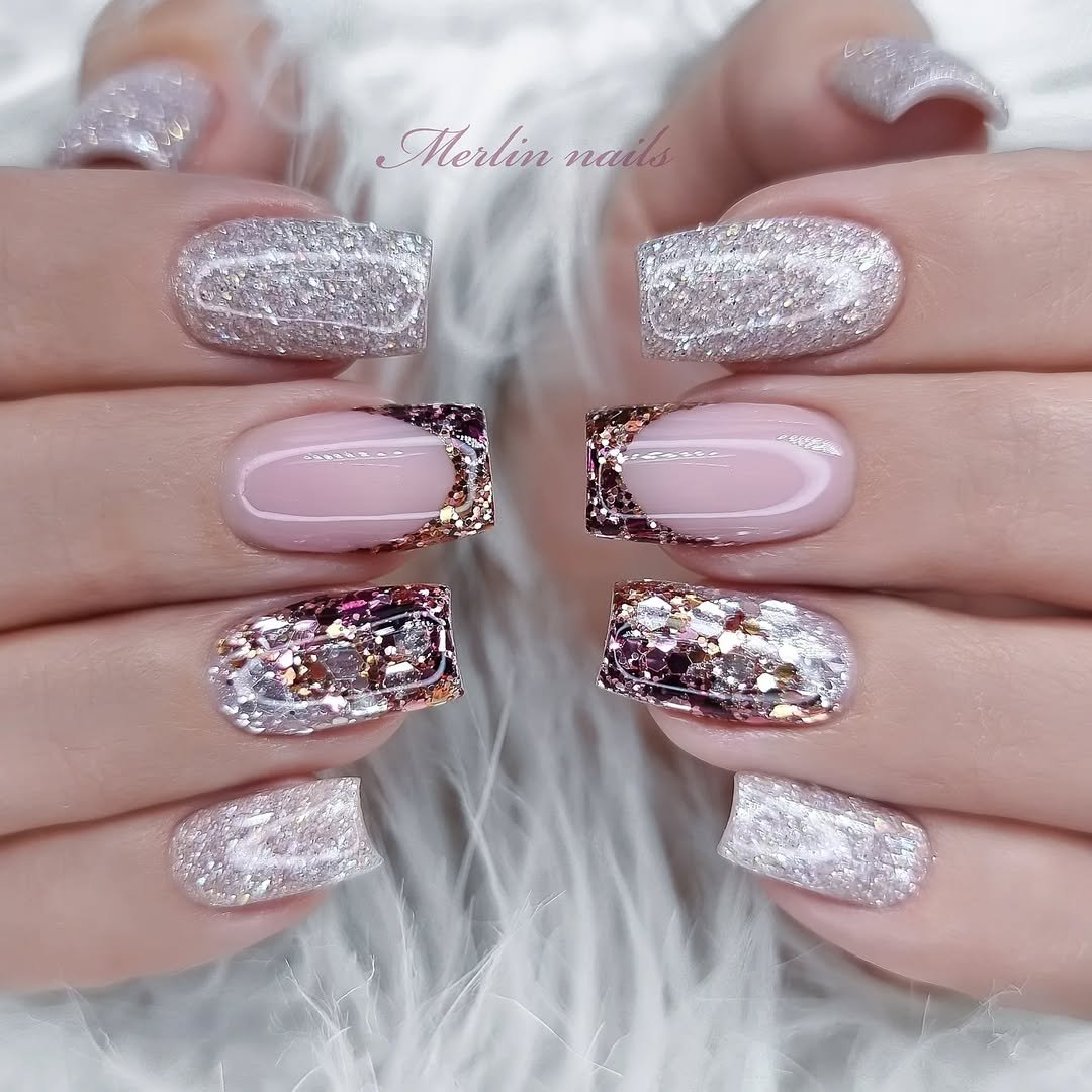 The squared shape really allows the glitter to shine, giving each nail a bold, architectural finish. These nails feel like they were made for holiday parties or a night out — chic, dazzling, and a little bit decadent.