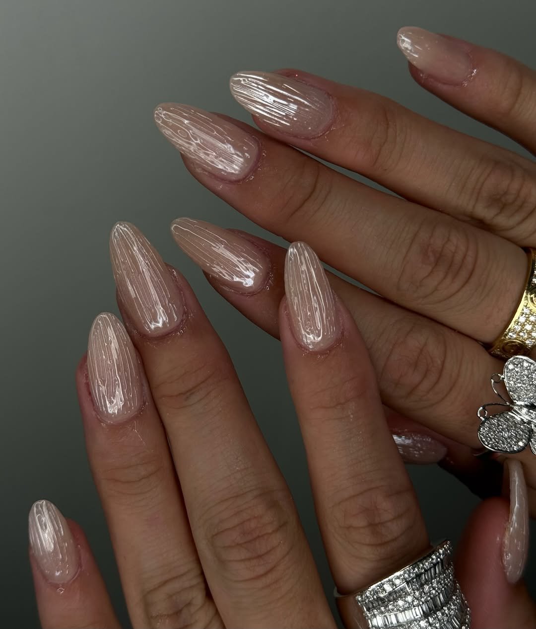 Sometimes simple is the most striking. @nailsbytrinnie proves it with this set of glazed, almond-shaped neutrals. A sheer beige base is topped with a soft, pearlescent sheen that looks almost like glass. The subtle lines give it texture, like delicate brushstrokes or rippling silk.
