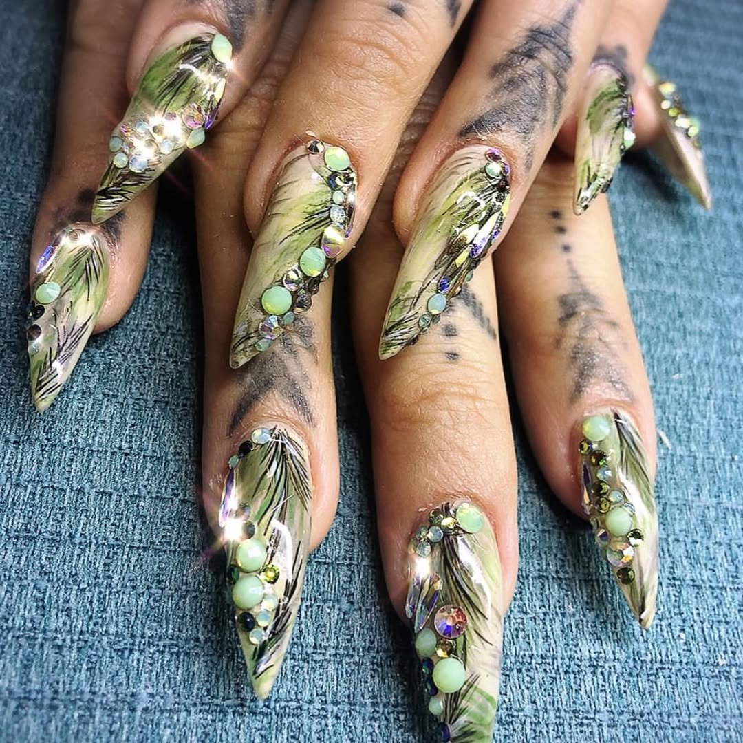The scattered rhinestones almost feel like dew drops catching the morning sun. These nails have that “one with nature, but still fabulous” energy, perfect for someone who loves a little magic in their style.