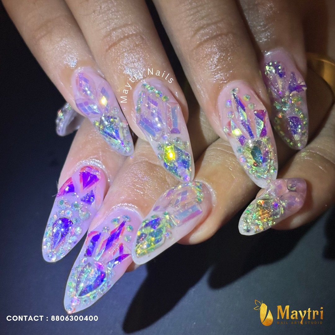 This set from @maytri_nails_pune looks like it’s been cut straight from a prism. Layers of iridescent foil and crystal-like pieces give the illusion of shattered glass catching rainbow light, all sealed under a glossy top coat. It’s maximalist in the best way — bright, bold, and sparkling from every angle.