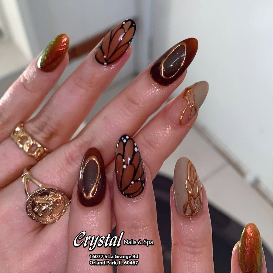 @crystalnailsorlandpark delivers a showstopper with this butterfly-inspired design in rich brown, amber, and gold. The almond shape lets those wing-like details flutter right to the tips, while golden wire accents and molten chrome give it a luxurious touch.