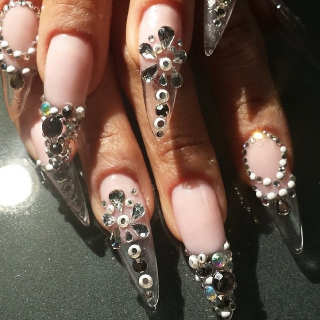 Here’s where nails become jewelry. These sharp stiletto tips are encrusted with black and clear crystals in floral arrangements that sparkle with every move. Against the sheer nude base, the rhinestones look almost like couture embellishments.