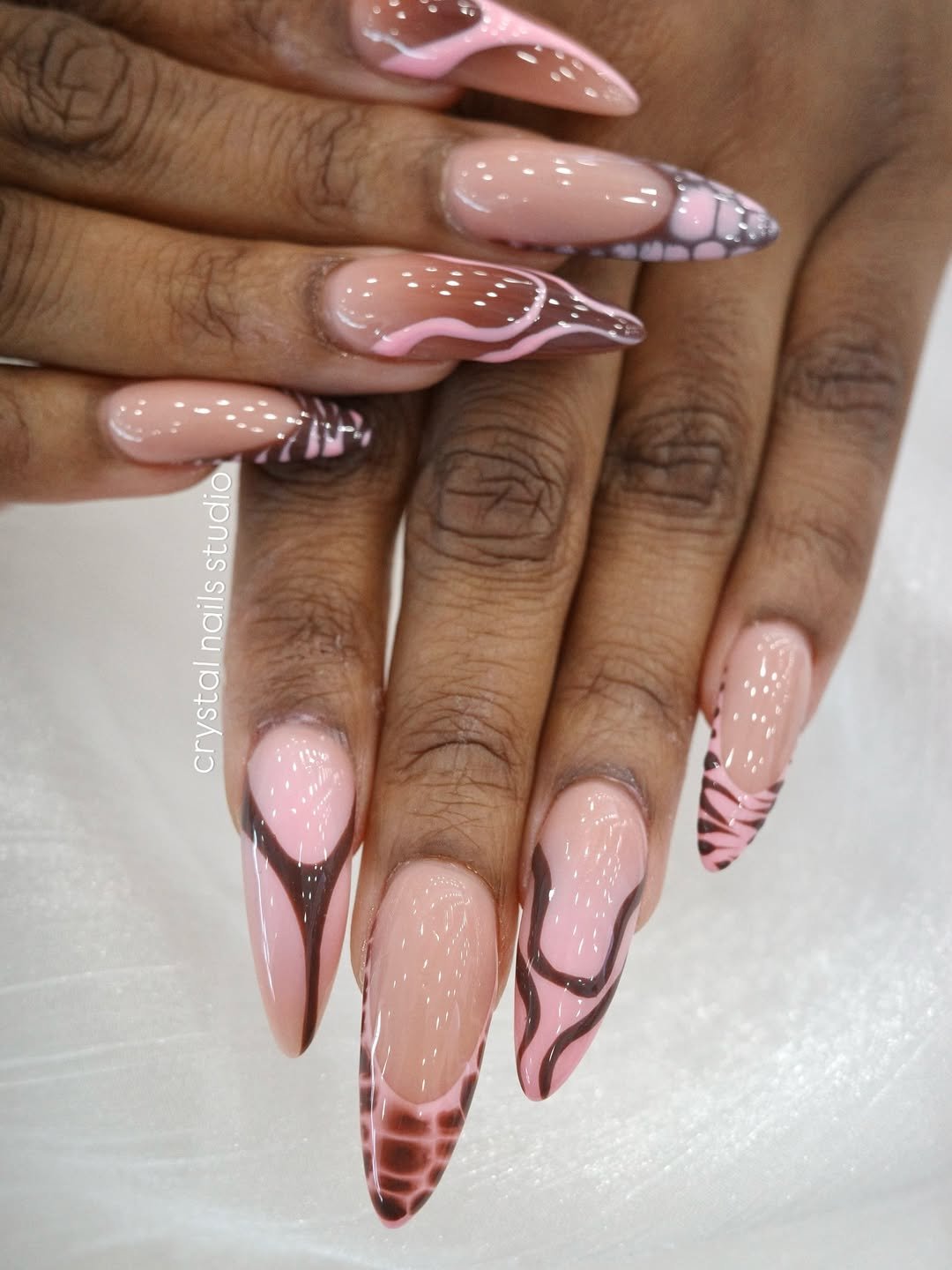 Soft pinks, chocolate swirls, and trippy groove lines come together in this abstract stiletto set from @crystal_nailsstudio. There’s a retro-futuristic feel here—like Y2K bubblegum met a lava lamp—and the mix of glossy finishes keeps it looking luxe.
