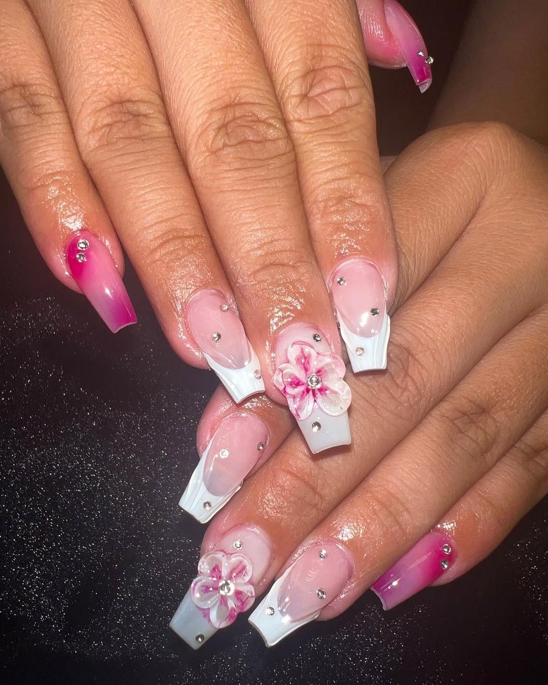 These nails feel like spring bottled up and set delicately at your fingertips. The mix of soft pink ombré and crisp white tips gives the perfect canvas for those 3D floral accents to bloom. The tiny rhinestone centers make the flowers pop, adding just the right sparkle without stealing the show.