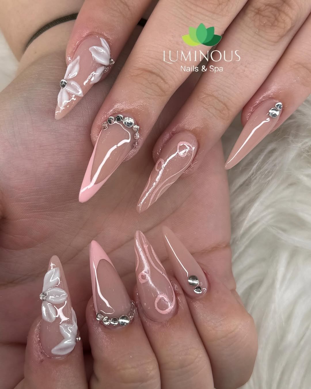 @luminousbentonville goes for understated elegance with this blush-toned set. Elongated almond tips are topped with soft sculptural petals, delicate swirls, and just a touch of crystal detail. It’s romantic and refined, like something straight out of a bridal mood board.