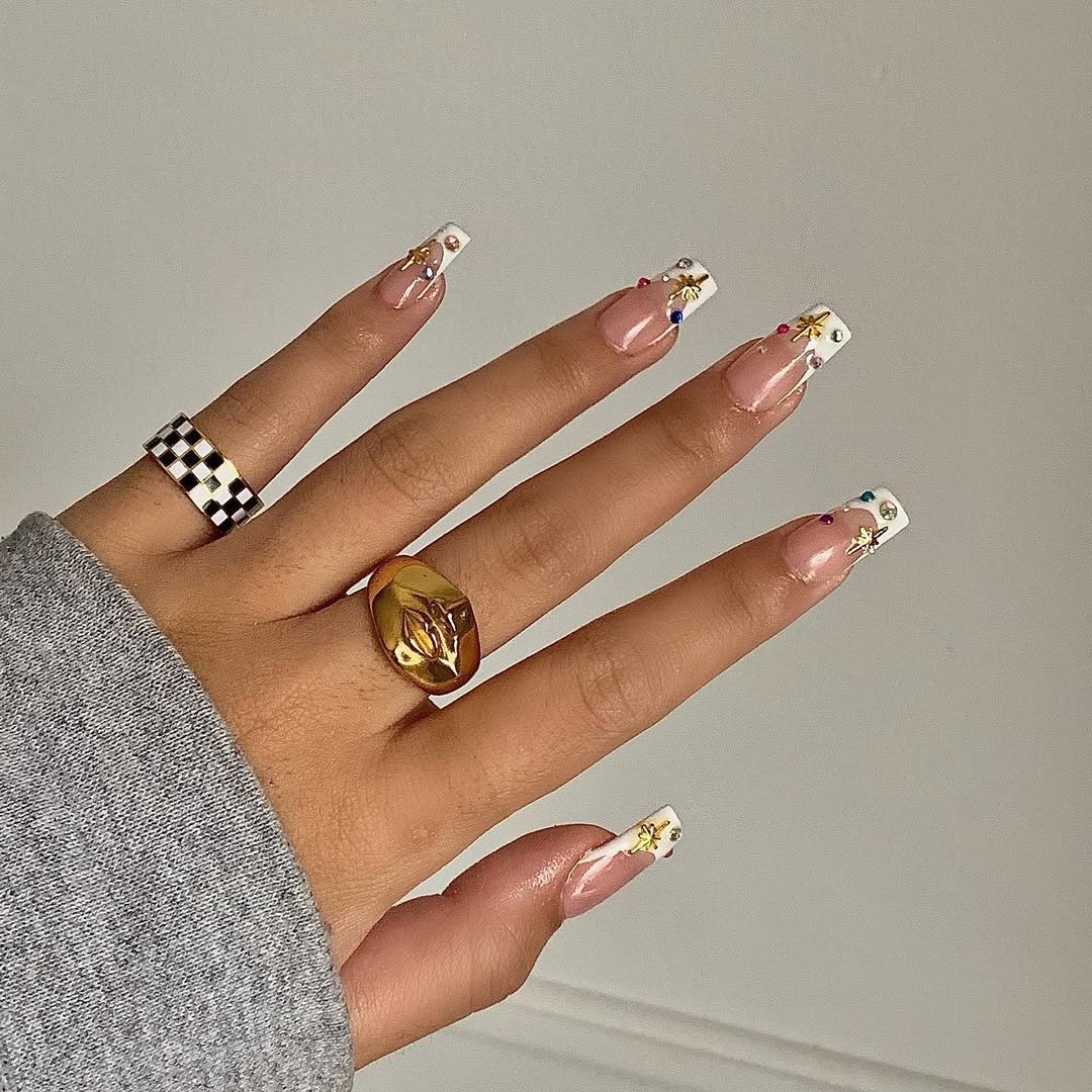 @ nailsbyelisee plays with a modern French tip, layering crisp white edges with little star charms and jewel accents. It’s playful but still chic, giving a fresh update to a classic look. The gems bring a sprinkle of color and sparkle without overwhelming the design.