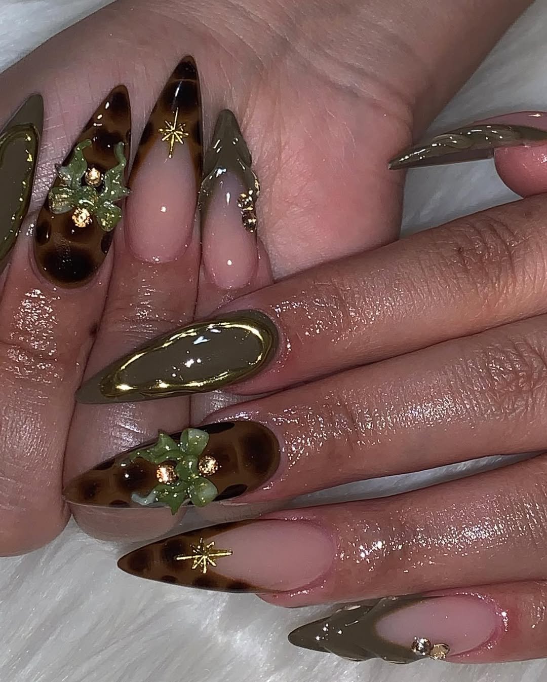 Tortoise shell and earthy olive green? Yes, please. This deliciously rich combo by @bluestreakcrystals mixes nature-inspired textures with a luxe, glassy finish. Each nail feels like it was dipped in honey and kissed by fall foliage—complete with little gold stars and sculpted 3D succulents that add an artisanal, almost enchanted forest vibe.