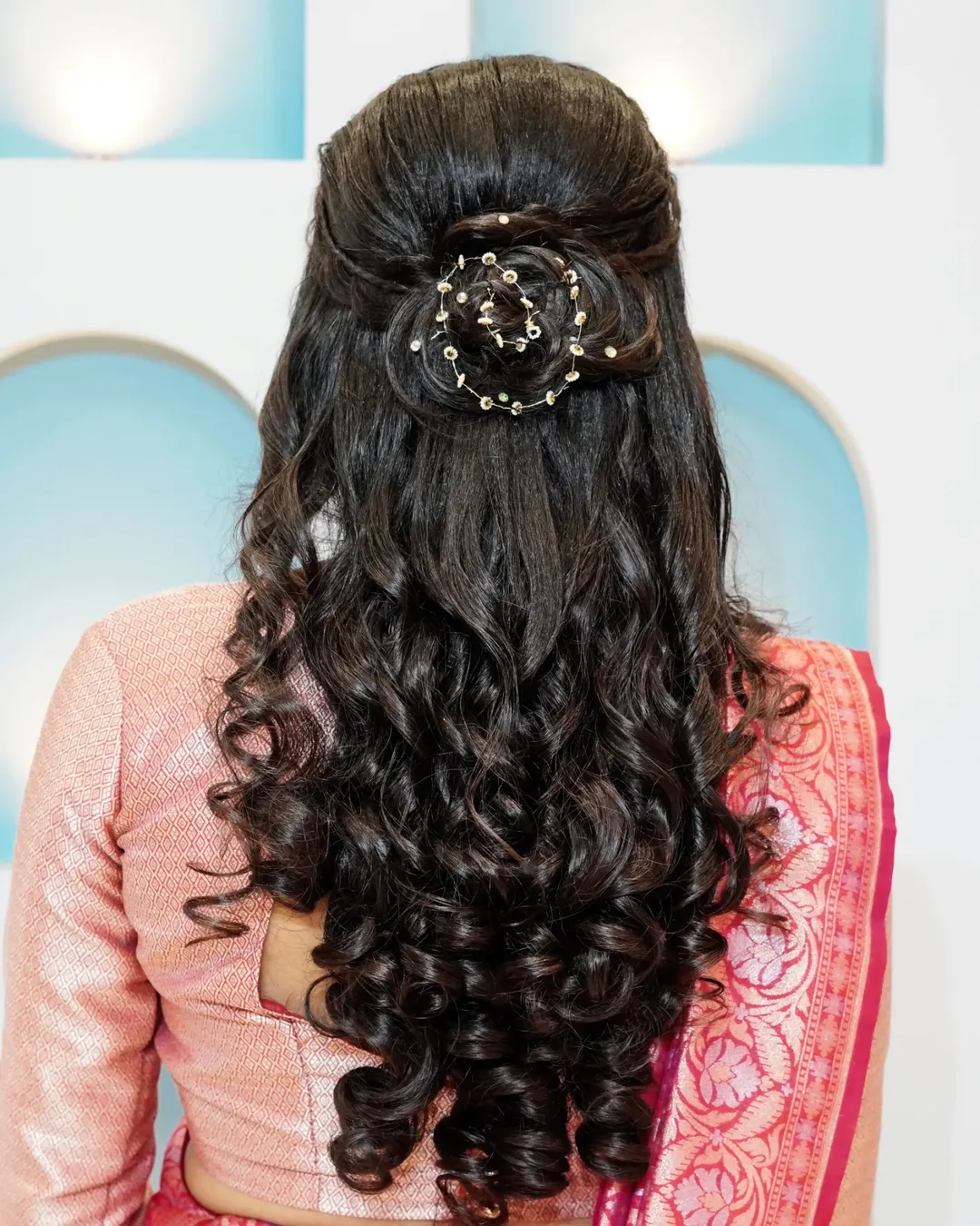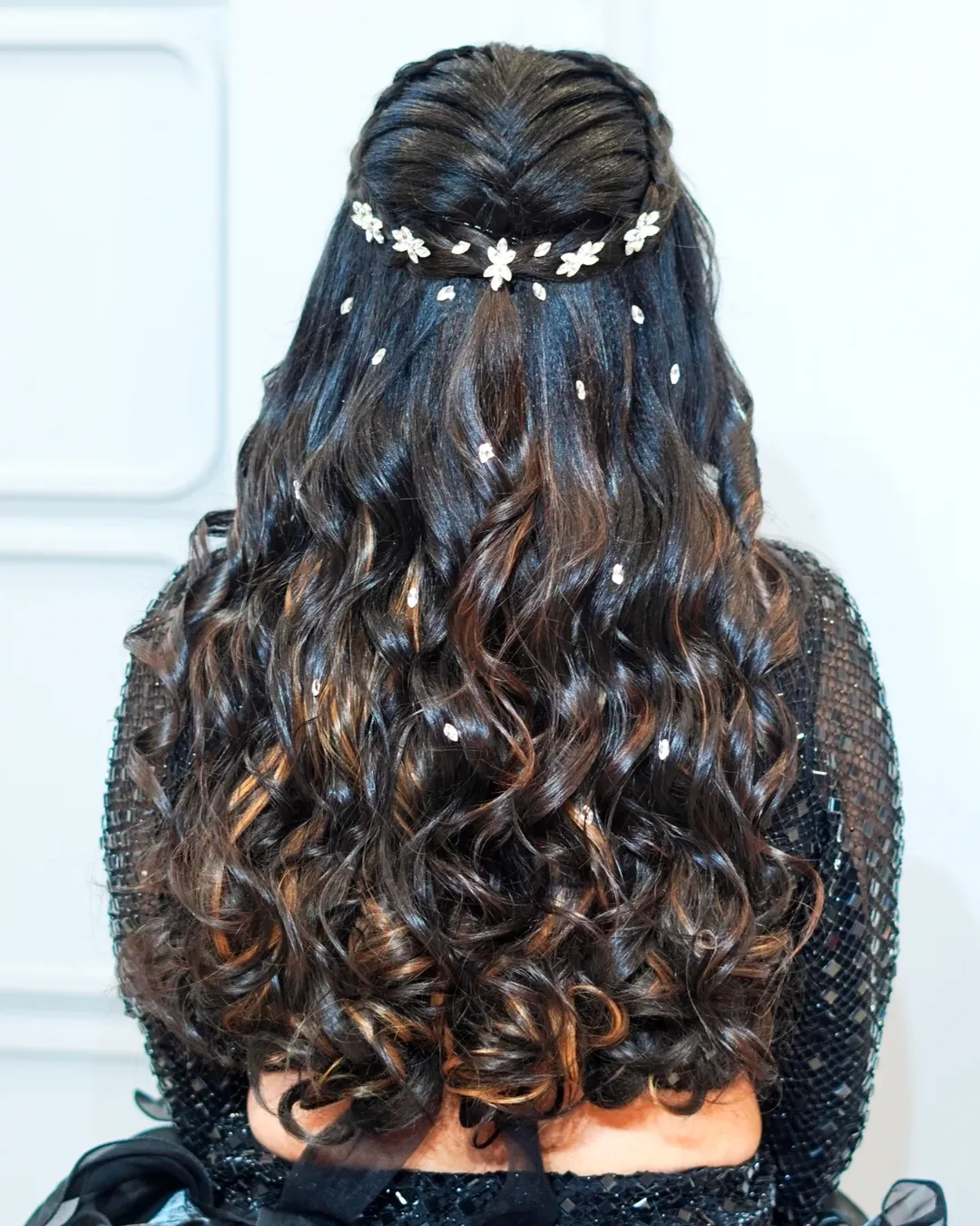 This look is pure romance. The curls are defined, glossy, and styled in a way that feels luxurious without feeling heavy. The detailing adds just the right amount of magic.