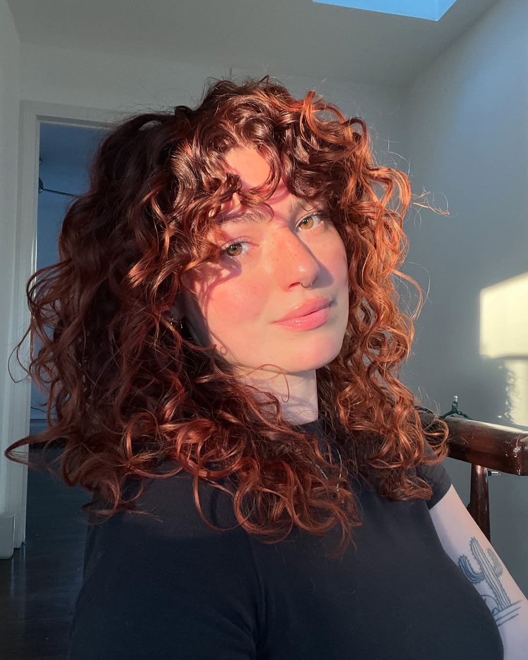 These curls tumble softly with layered movement, while the fringe adds a playful, lived-in touch. The warm tone makes every curl feel richer and more dimensional.