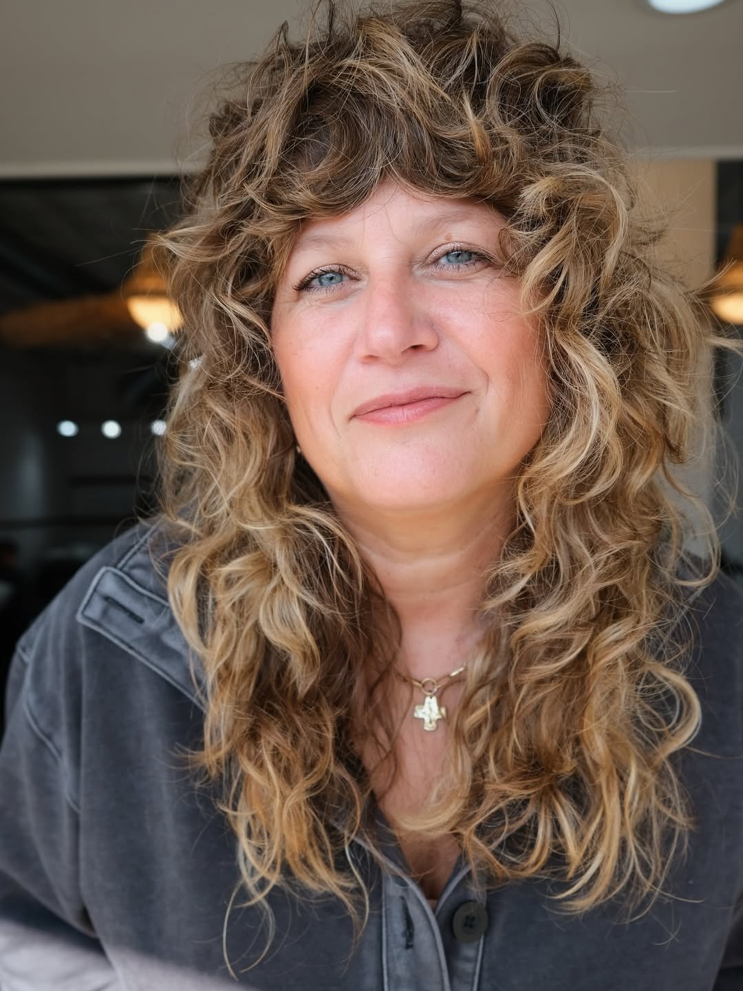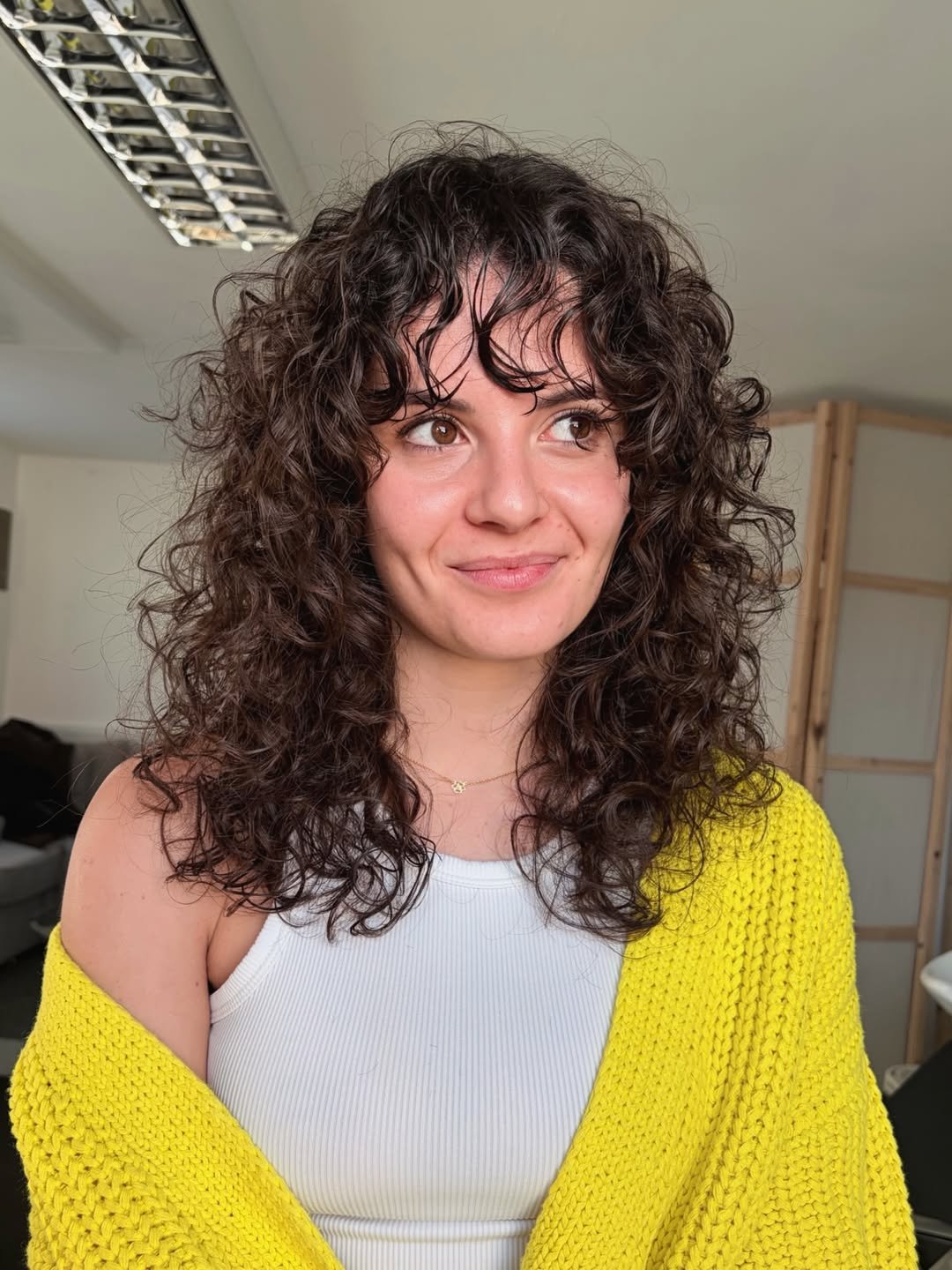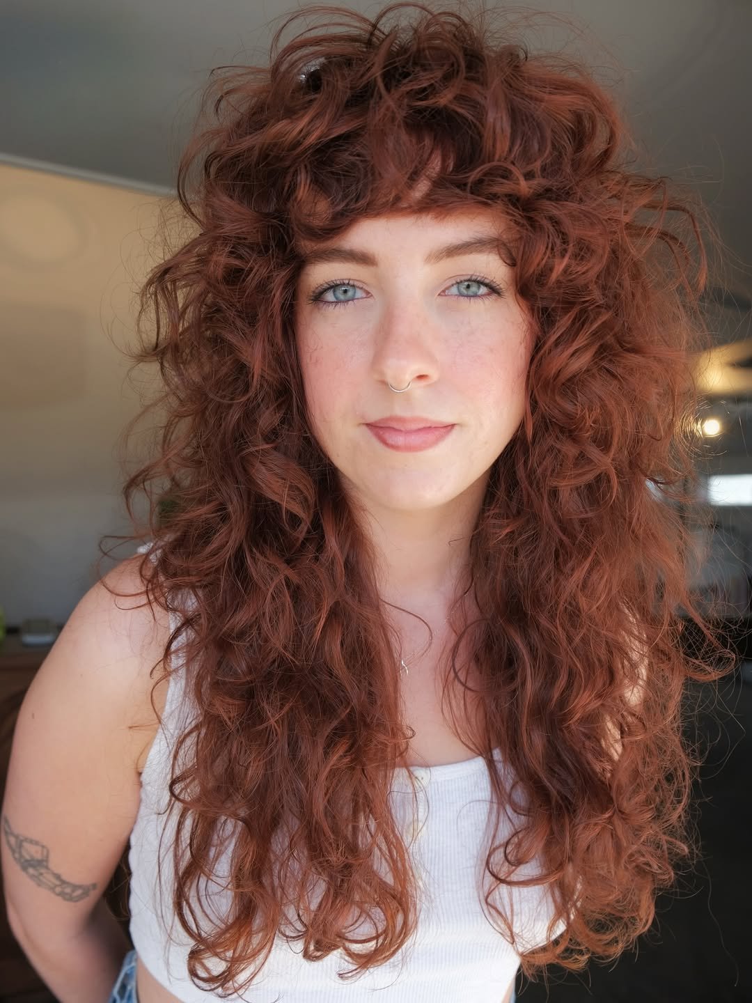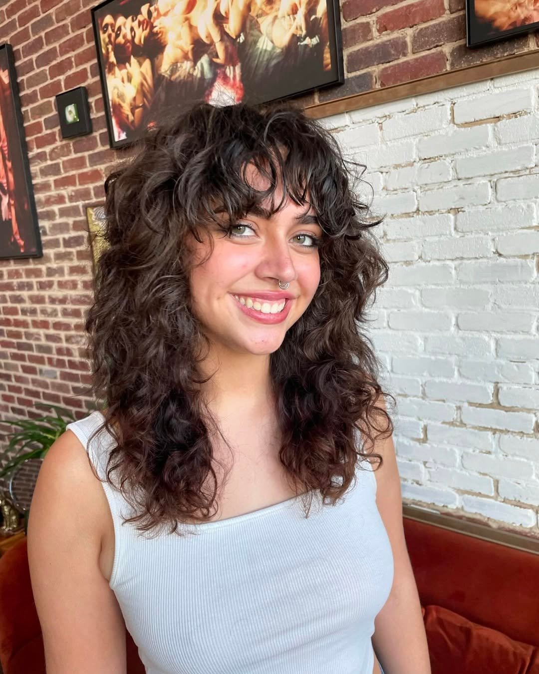 This curly shag brings texture, layers, and personality all into one look. The fringe frames the face beautifully while the curls create effortless volume.