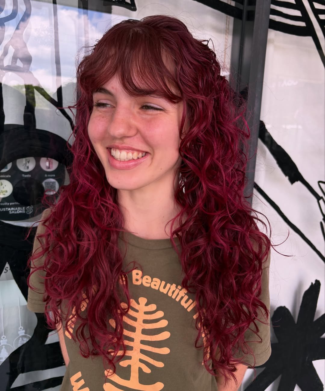 This bold curly look pairs rich color with soft texture, creating instant impact. The fringe adds character, while the length keeps everything balanced and wearable.