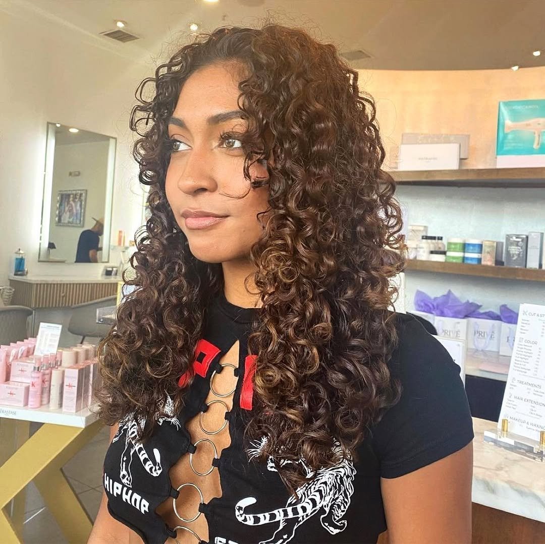 These curls have that romantic, slightly undone vibe that feels timeless. The layering keeps things airy, while the length lets the curls really show off their pattern.