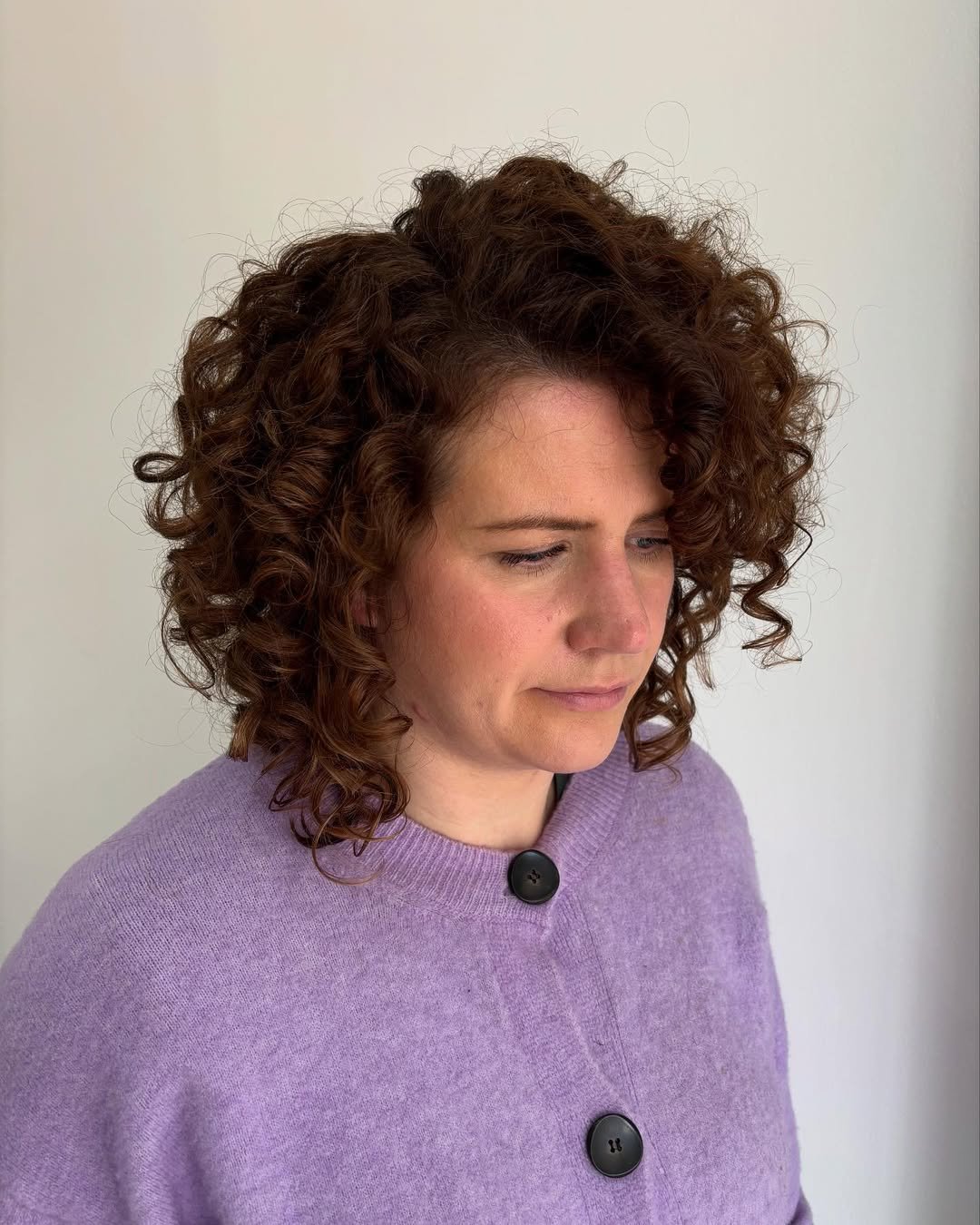 This cropped curly style keeps things neat while letting texture do the talking. The shape is rounded and flattering, never harsh or overly styled.