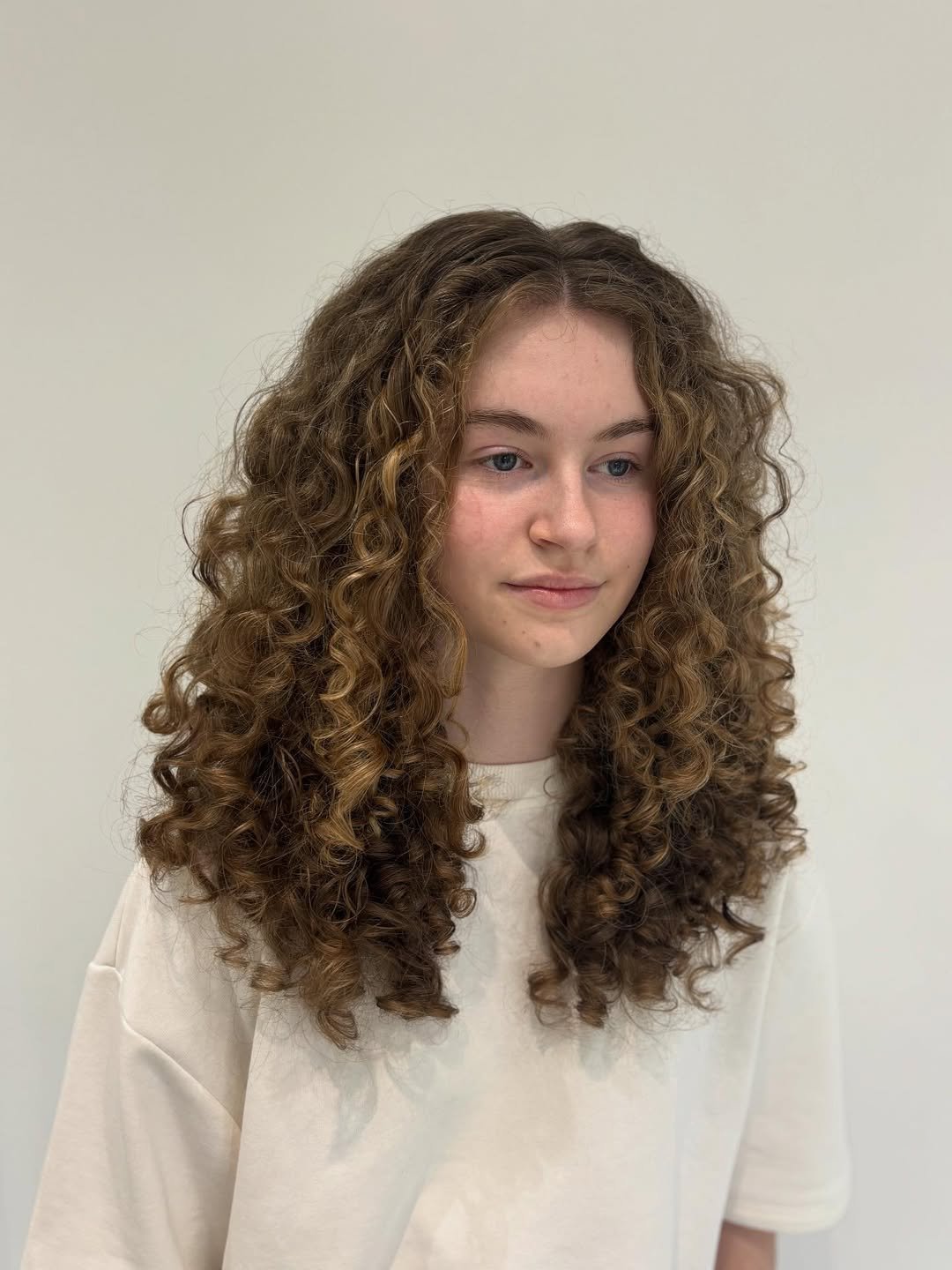 These curls fall effortlessly, creating a soft, youthful silhouette. The length and layering allow movement without weighing the curls down.