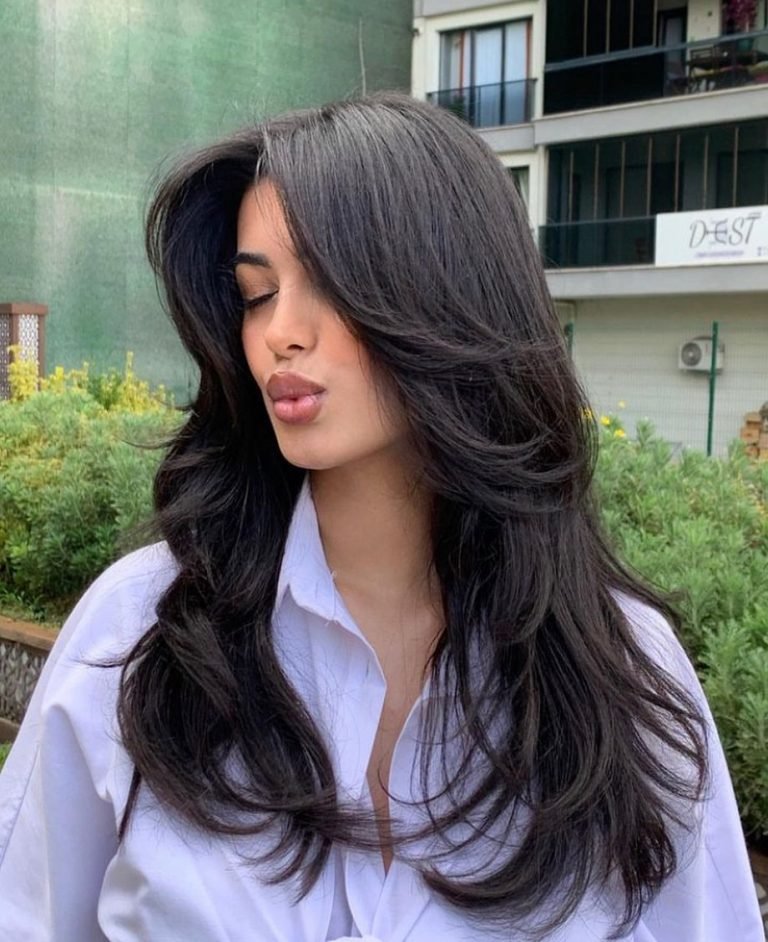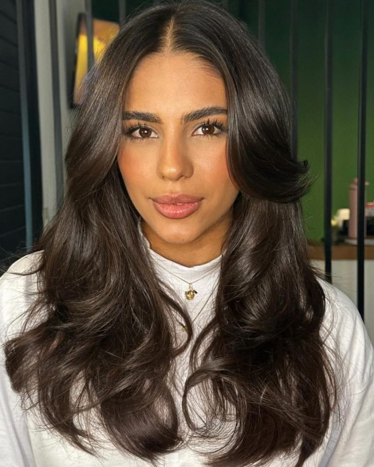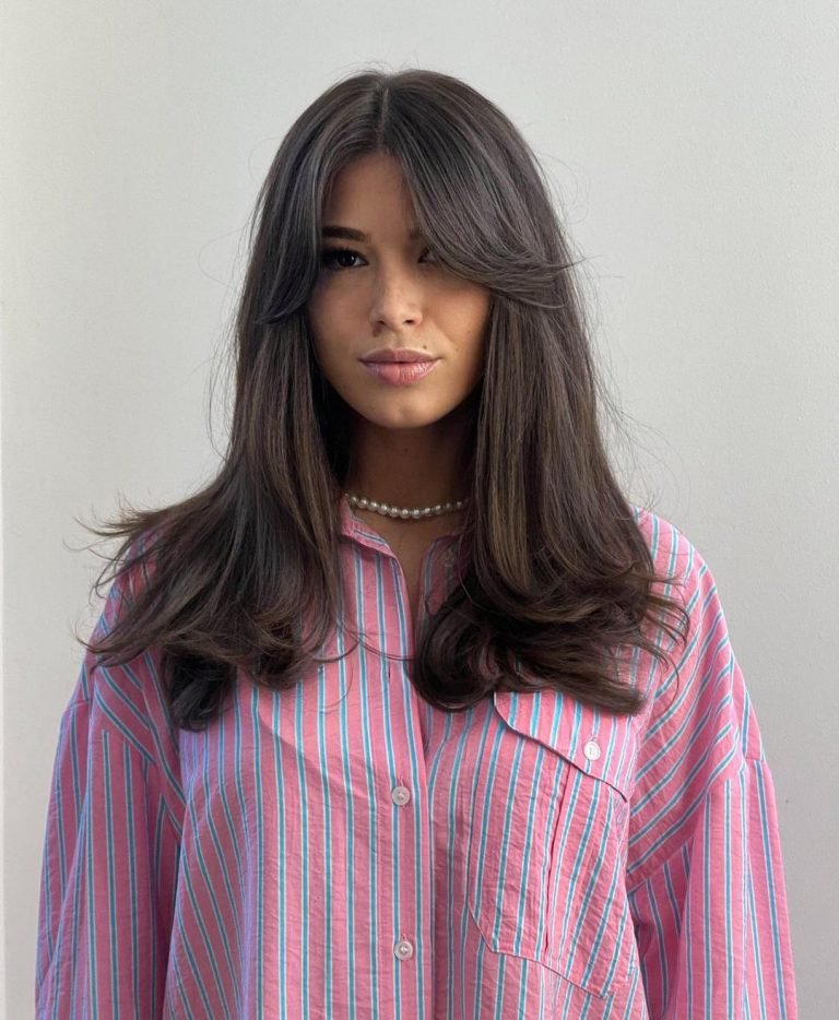 This deep chocolate shade looks almost mirror-shiny, and the curtain bangs sit with the most elegant curve — framing the face without stealing the show. The layers have just enough drama to feel intentional while still staying wearable day-to-day.